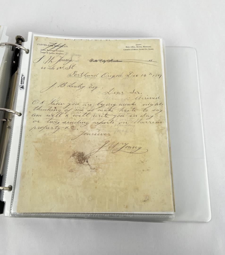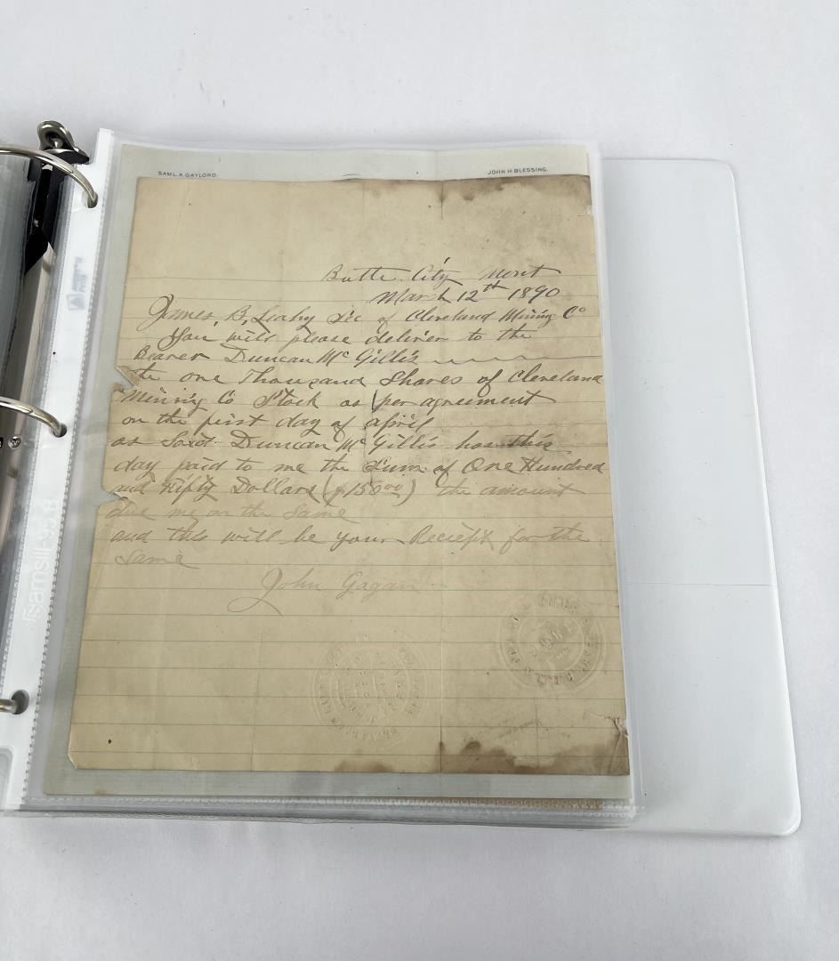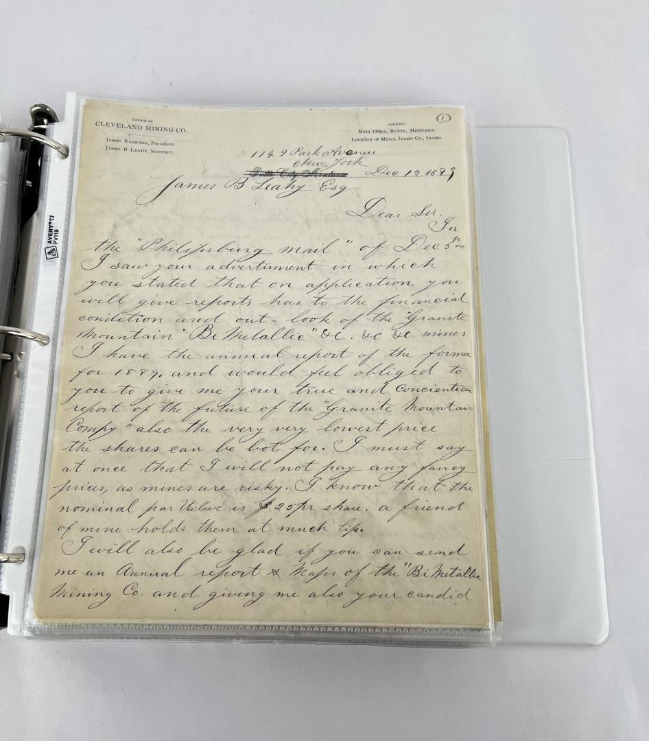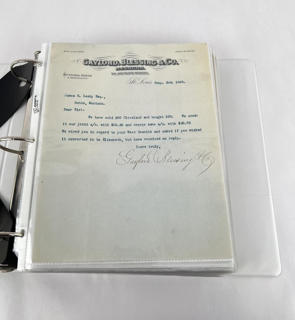 100 items from James B Leahy from September, 1889 through April, 1890 James B. Leahy was a very prominent figure in the Montana mining industry. He was involved in many different aspects of the mining industry throughout his career. First and foremost, he was a mining stock promoter in Butte. He was responsible for promoting stocks of many important Montana mining companies including, but not limited to, Moulton, Flint Creek, West Granite, Black Pine, Montana Fire Clay, and Granite Mountain. As a stock promoter, he worked closely with the stock brokerage company, Samuel Gaylord & Co. This collection is full of correspondence from many different individuals who were interested in buying stocks from Leahy. There is also correspondence from Samuel Gaylord & Co. about the current selling price of various stocks. These pieces of correspondence are a great window into the daily fluctuations of the mining stock market in Montana.