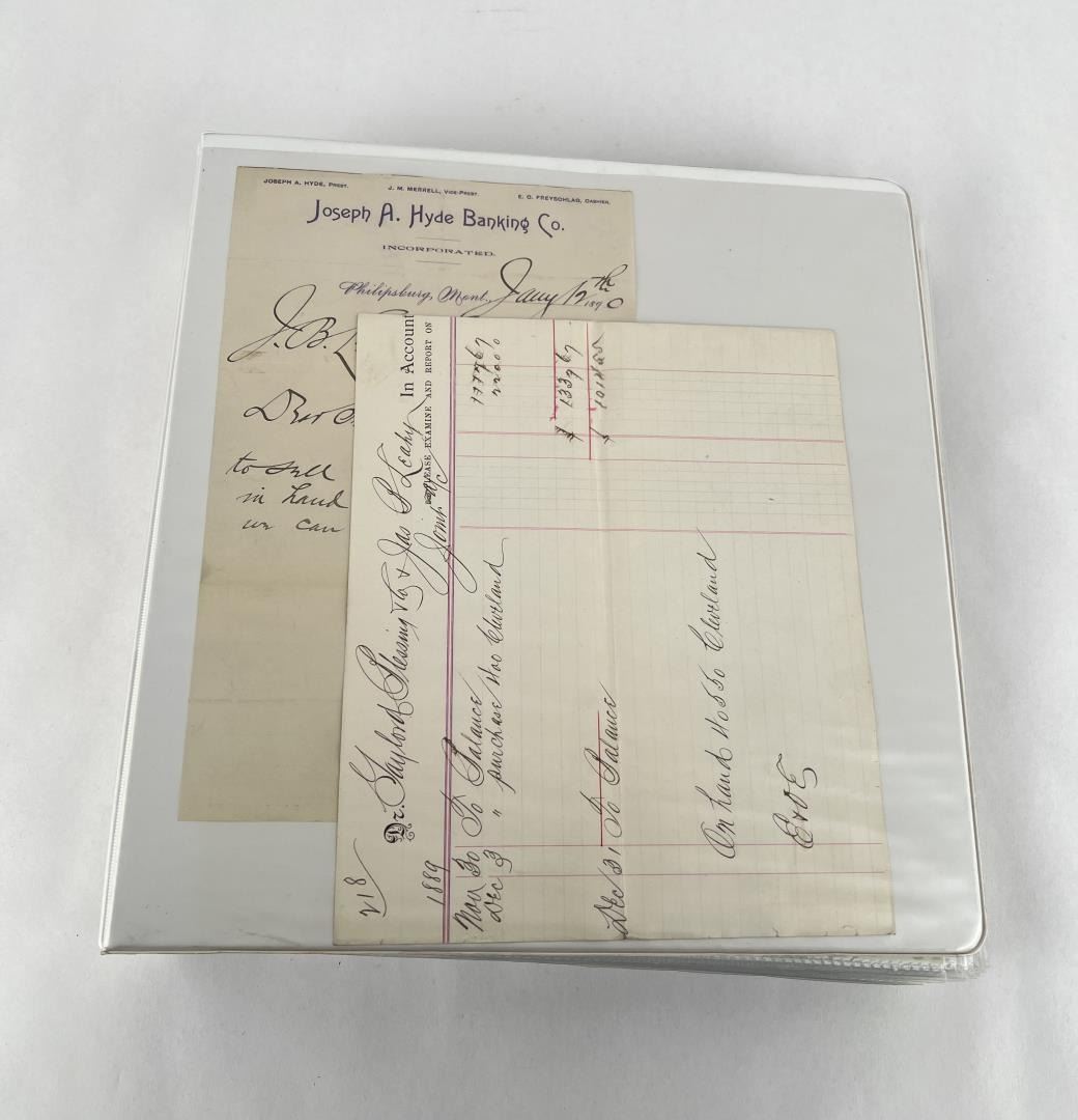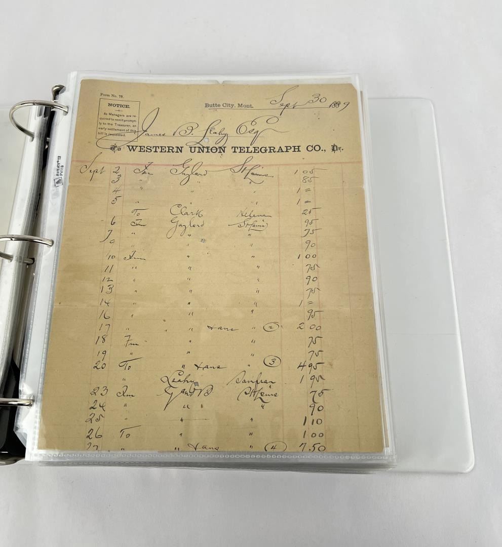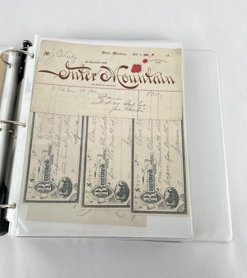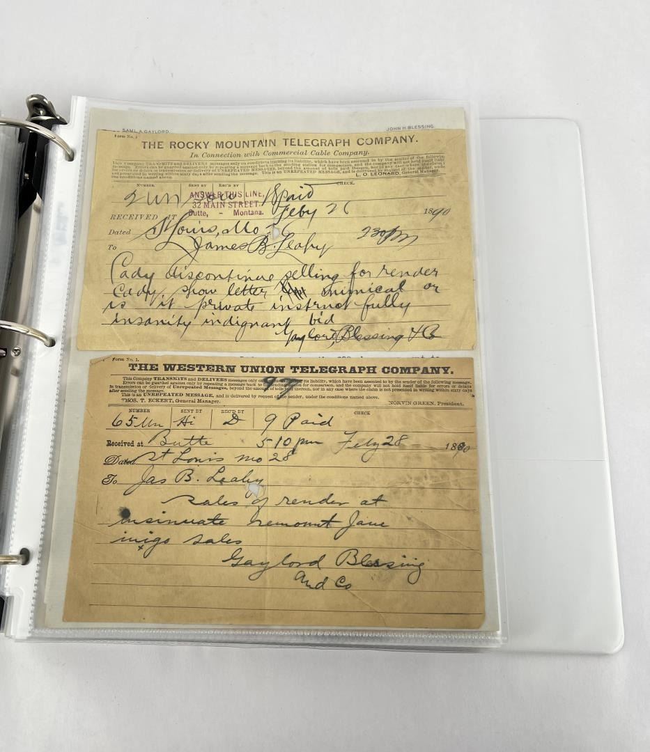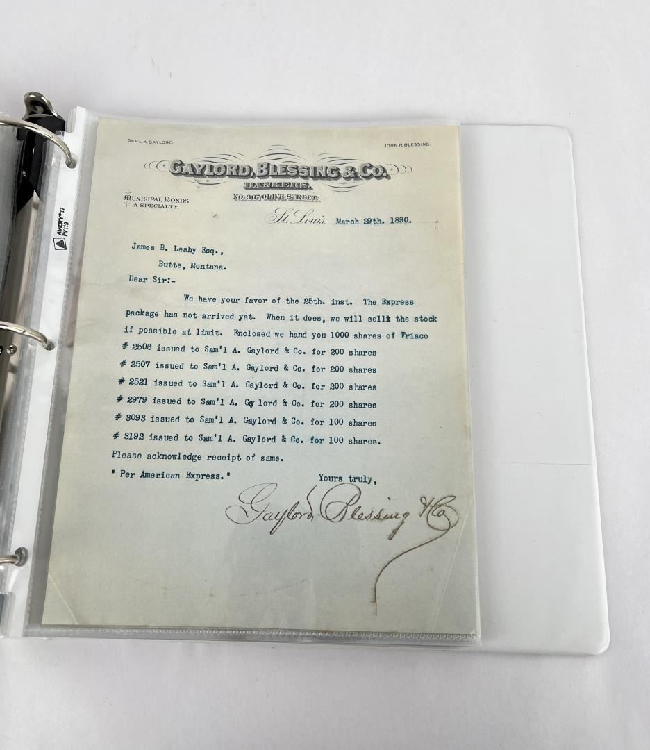 100 items from James B Leahy from September, 1889 through April, 1890 James B. Leahy was a very prominent figure in the Montana mining industry. He was involved in many different aspects of the mining industry throughout his career. First and foremost, he was a mining stock promoter in Butte. He was responsible for promoting stocks of many important Montana mining companies including, but not limited to, Moulton, Flint Creek, West Granite, Black Pine, Montana Fire Clay, and Granite Mountain. As a stock promoter, he worked closely with the stock brokerage company, Samuel Gaylord & Co. This collection is full of correspondence from many different individuals who were interested in buying stocks from Leahy. There is also correspondence from Samuel Gaylord & Co. about the current selling price of various stocks. These pieces of correspondence are a great window into the daily fluctuations of the mining stock market in Montana.