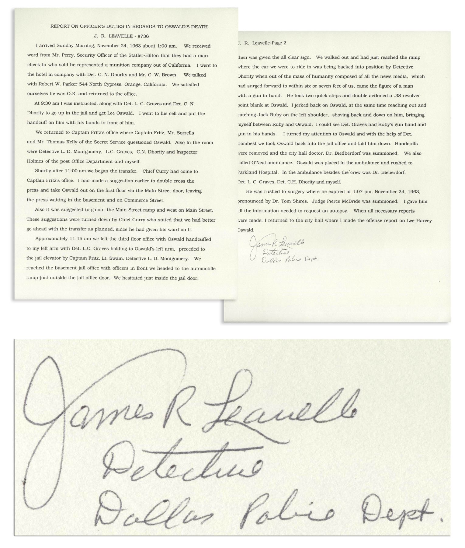 James R. Leavelle signed souvenir police report filed after the killing of Lee Harvey Oswald. As the officer handcuffed to Oswald during the shooting, Leavelle was in a unique position to recount the entire event. Interestingly, Leavelle states here that he wanted to ''double cross the press and take Oswald out on the first floor via the Main Street door, leaving the press waiting in the basement and on Commerce Street.'' Instead, report reads in part, ''...We walked out and...when out of the mass of humanity composed of all the news media, which had surged forward to within six or seven feet of us, came the figure of a man with a gun in hand. He took two quick steps and double actioned a .38 revolver point blank at Oswald. I jerked back on Oswald, at the same time reaching out and catching Jack Ruby on the left shoulder, shoving back and down on him, bringing myself between Ruby and Oswald. I could see Det. Graves had Ruby's gun...[signed] James R Leavelle / Detective / Dallas Police Dept.'' Two page document on two sheets measures 8.5'' x 11''. Near fine condition. Accompanied by previous auction sticker from RR Auction.