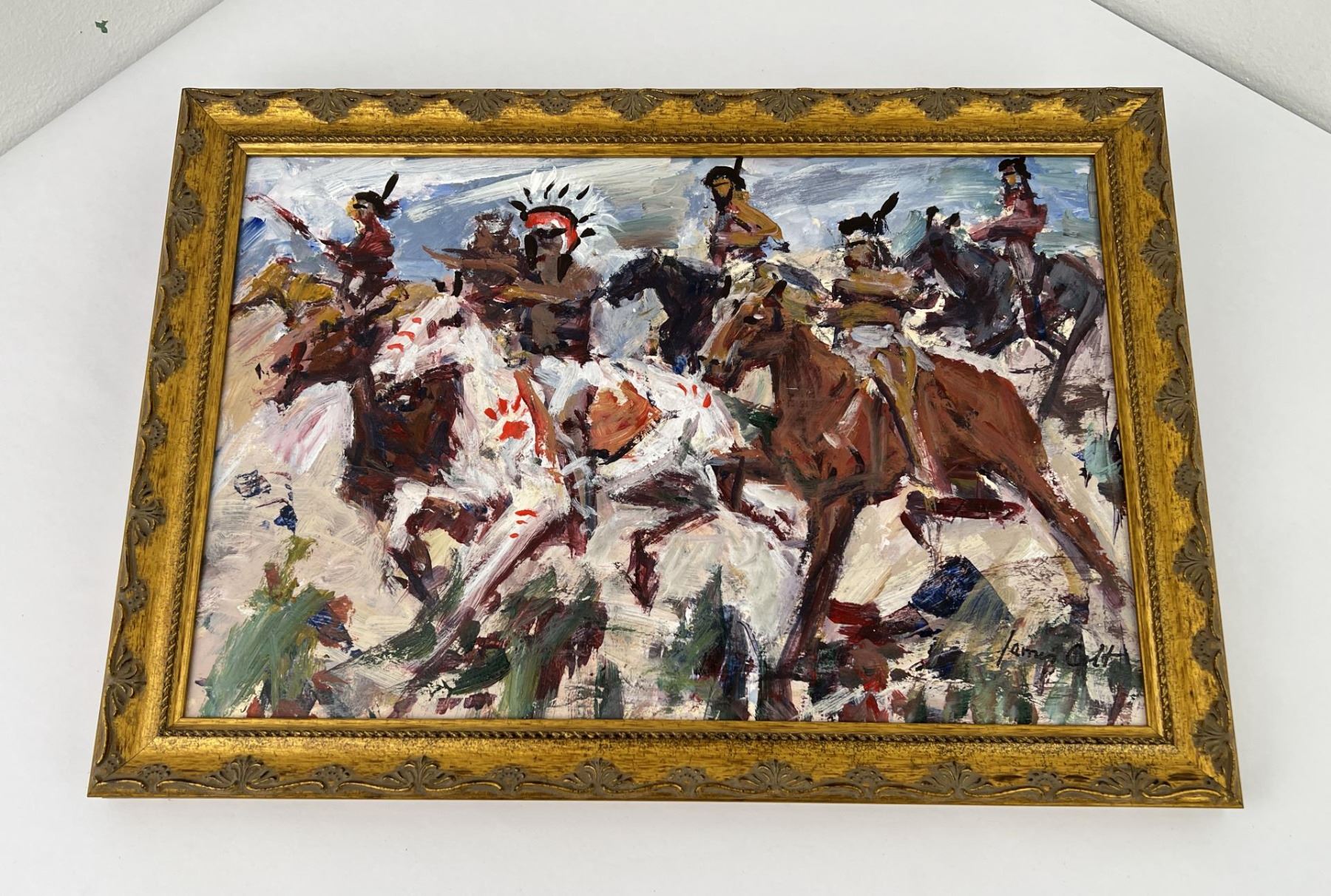 Indian War Party. 13 1/2" by 19" framed. James Lee Colt (1922 - 2005) was active/lived in California, Arizona, Kansas, Missouri. James Colt is known for Impressionist paintings-western genre, landscape. James Colt was forever the teacher of the philosophy behind great art. This quote from him sums up the core values of his life works: "Every great painting has it's own 'Tour De Force'. It conjures up human perceptions of fear, nostalgia, peace, or horror. You want to be sure you can back up your profundity of thought graphically. You want to set up an anxiety and tension in the viewer." James L. Colt was born James Lee Clutter on December 18, 1922 in Kansas City, Missouri. He changed his name to James Colt in 1977. His parents were Edna Frances and Chester A. Clutter. His father died in 1926, and his mother, Edna, remarried in 1927 to Harrrison G. Haskin. Colt moved to Southern California with his mother, step father, and older sister Marian between 1927-1930.