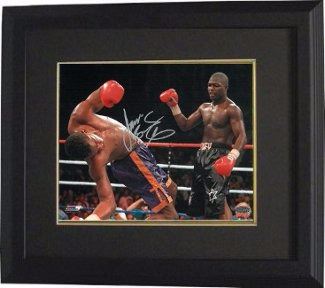 James "Lights Out" Toney has competed in five weight classes from middleweight to heavyweight. Toney is a former three-weight world champion. Toney is considered to be one of the finest defensive fighters in modern boxing history. He uses a style known as the shoulder roll technique. He defended his IBF Super Middleweight title against former IBF Light Heavyweight champion Prince Charles Williams, whom he knocked out in the 12th and final round. This win paved the way for his fight with Roy Jones, Jr..This is an 16X20 photo signed by James Toney from that fight when he knocked out Prince Charles Williams in the 12th Round. Leaf Authentic Hologram and Certificate of Authenticity from Athlon Sports. Custom Black Mat and Premium Black Frame as shown.