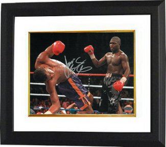 James "Lights Out" Toney has competed in five weight classes from middleweight to heavyweight. Toney is a former three-weight world champion. Toney is considered to be one of the finest defensive fighters in modern boxing history. He uses a style known as the shoulder roll technique. He defended his IBF Super Middleweight title against former IBF Light Heavyweight champion Prince Charles Williams, whom he knocked out in the 12th and final round. This win paved the way for his fight with Roy Jones, Jr..This is an 16X20 photo signed by James Toney from that fight when he knocked out Prince Charles Williams in the 12th Round. Leaf Authentic Hologram and Certificate of Authenticity from Athlon Sports. Custom White Mat and Premium Black Frame as shown.