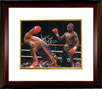 James "Lights Out" Toney has competed in five weight classes from middleweight to heavyweight. Toney is a former three-weight world champion. Toney is considered to be one of the finest defensive fighters in modern boxing history. He uses a style known as the shoulder roll technique. He defended his IBF Super Middleweight title against former IBF Light Heavyweight champion Prince Charles Williams, whom he knocked out in the 12th and final round. This win paved the way for his fight with Roy Jones, Jr..This is an 8x10 photo signed by James Toney from that fight when he knocked out Prince Charles Williams in the 12th Round. Leaf Authentic Hologram and Certificate of Authenticity from Athlon Sports. Custom White Mat and Premium Mahogany Frame as shown.