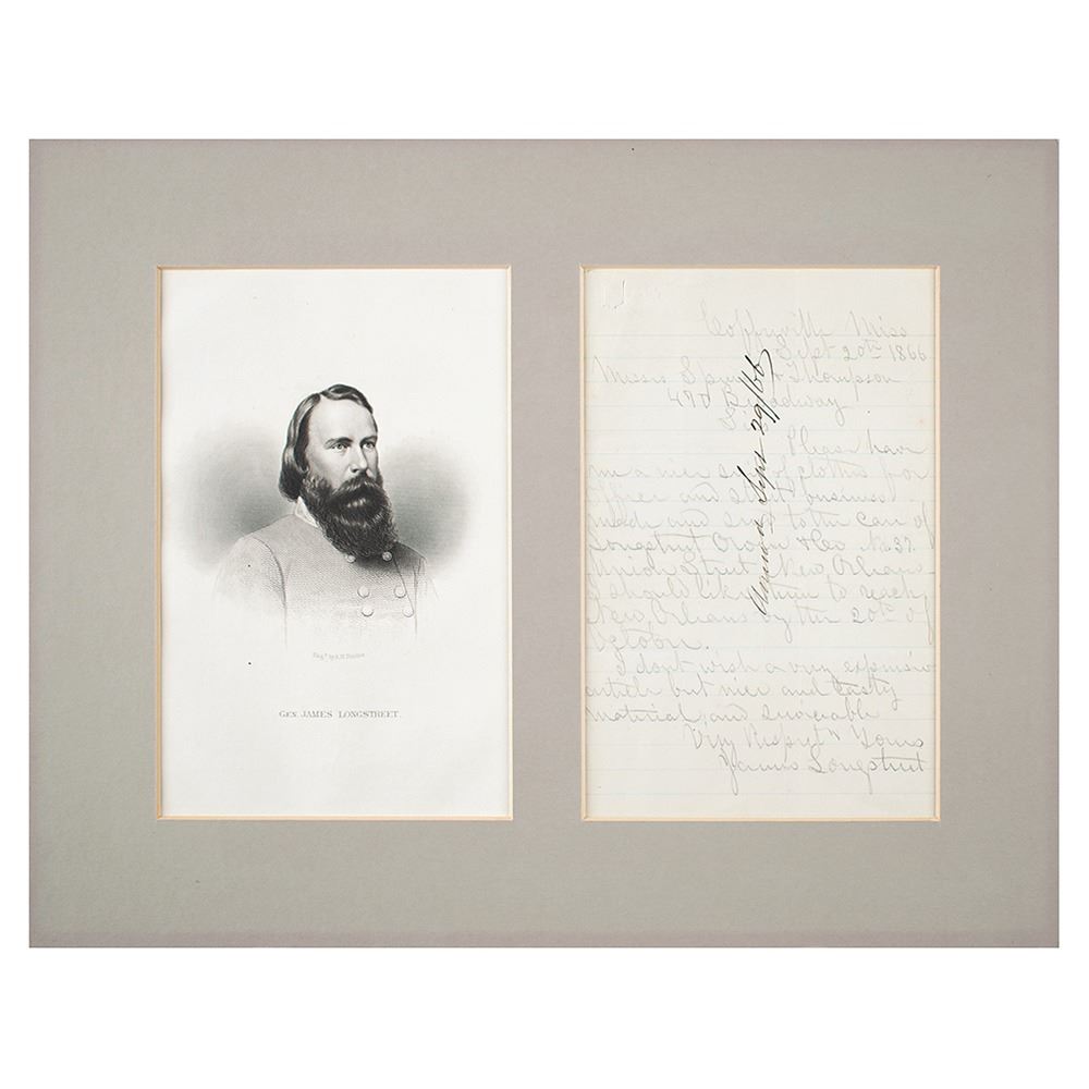 ALS in pencil, one page, 4.75 x 7.5, September 20, 1866. Addressed from Coffeyville, Mississippi, a handwritten letter from Longstreet to New York City tailors Spence and Thompson, in full: "Please have me a nice suit of clothes for office and street business, made and sent to the care of Longstreet Owen & Co. No. 37 Union Street, New Orleans. I should like them to reach New Orleans by the 20th of October. I don't wish a very expensive article but nice and tasty material, and serviceable." Docketing across the center of the letter in ink, "Answ'd Sept. 29/66." Matted with an engraved portrait to an overall size of 14 x 11. In fine condition.