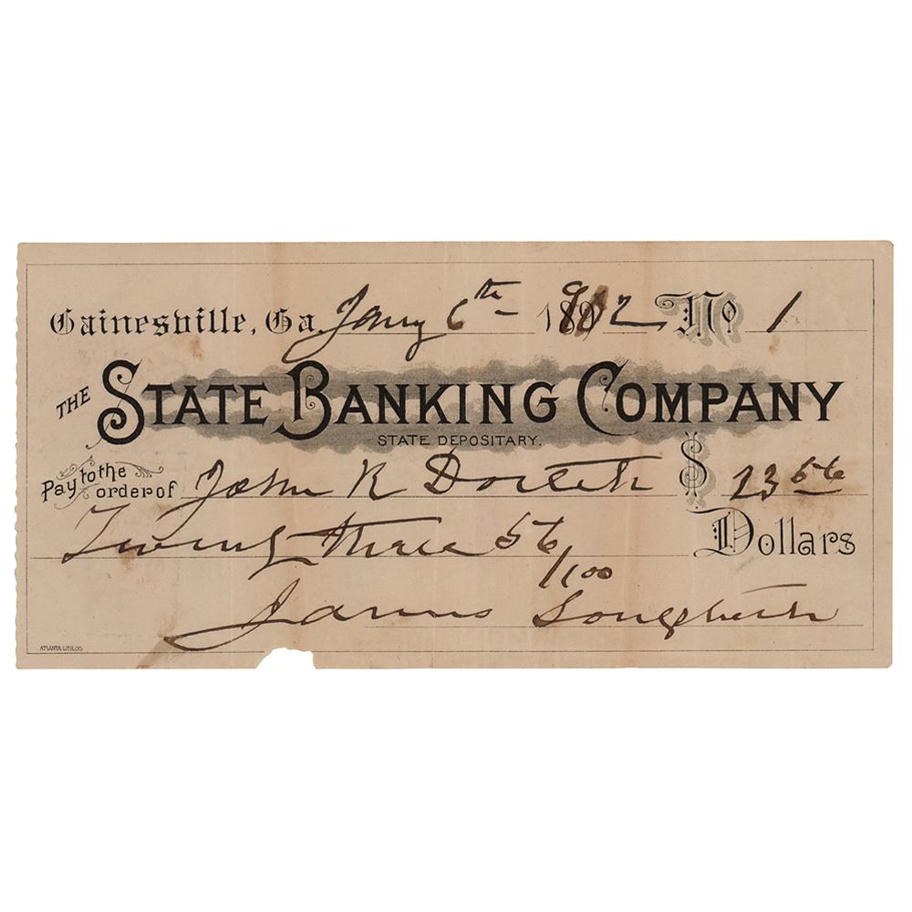 Confederate general (1821–1904) who distinguished himself at Bull Run, Fredericksburg, and Chickamauga. The State Banking Company check, 6.25 x 3, filled out and signed by Longstreet, "James Longstreet," payable to John R. Dortch for $23.56, January 6, 1902. In fine condition, with a chip to the bottom edge.