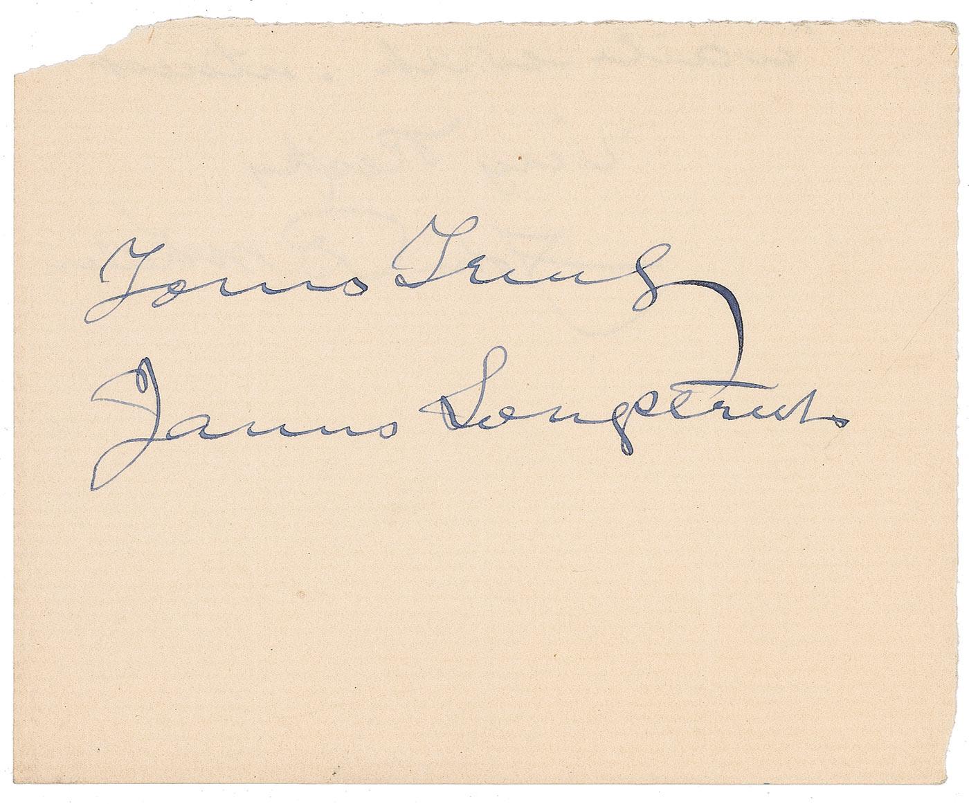 Confederate general (1821–1904) who distinguished himself at Bull Run, Fredericksburg, and Chickamauga. Ink signature, “Yours truly, James Longstreet,” on an off-white 5 x 4 sheet. In fine condition, with missing top left corner tip.