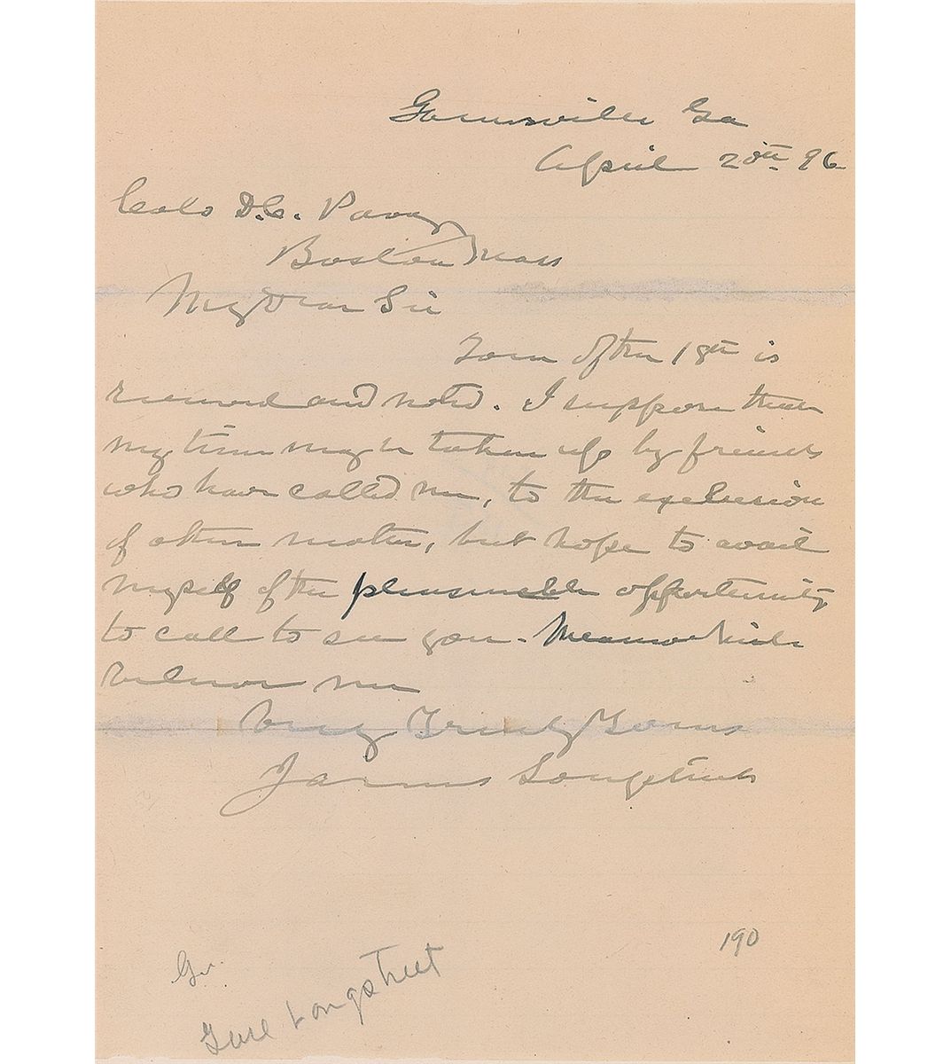 Confederate general (1821–1904) who distinguished himself at Bull Run, Fredericksburg, and Chickamauga. ALS, one page, 5.25 x 7.25, April 20, 1896. Letter to a Colonel. In part: “I suppose that my time may be taken up by friends who have called me, to the exclusion of other matters, but hope to avail myself of the pleasurable opportunity to call to see you.” Letter is inlaid to a slightly larger off-white sheet. In fine condition, with a uniform shade of mild toning and pencil notations to bottom edge.