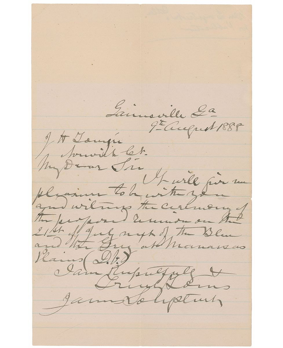 ALS, one page, lightly-lined, 5.5 x 8.5, August 9, 1888. Letter responding to a reunion invitation. In part: “It will give me pleasure to be with you and witness the ceremony of the proposed reunion on the 21st of July next of the Blue and the Gray at Manassas Plains.” Central vertical and horizontal folds (with one small tape-repaired edge separation and a vertical fold passing through a single letter of the signature), and mild toning to top and bottom from previous display, otherwise fine condition. Longstreet played a key role in securing the Confederate victory at the Second Battle of Bull Run, known to the South as the Second Manassas, although his actions and disobedience on the battlefield would be criticized for years to come.