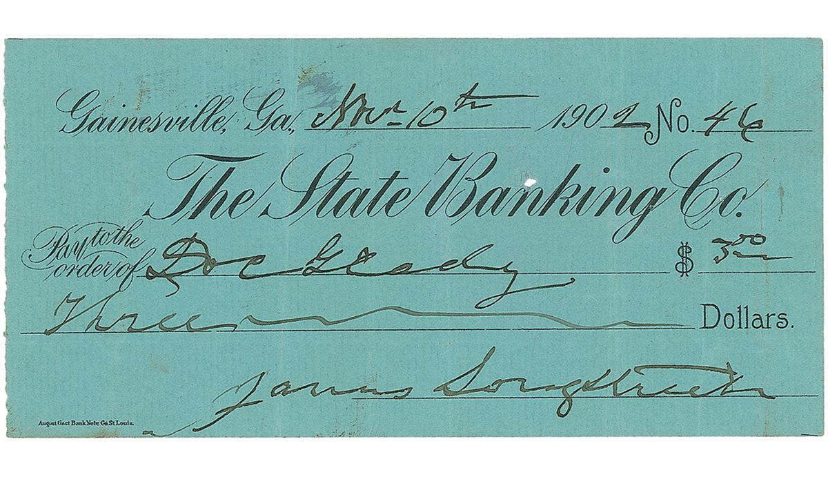 The State Banking Co. check, 5.75 x 2.75, filled out in another hand and signed by Longstreet, payable to Doc Grady for $3, November 10, 1902. Several vertical folds and some light soiling, with expected bank stamps and a cancellation hole to the body, otherwise fine condition. Rare in check form, this is a desirable format of one of the Civil War’s greatest tacticians.