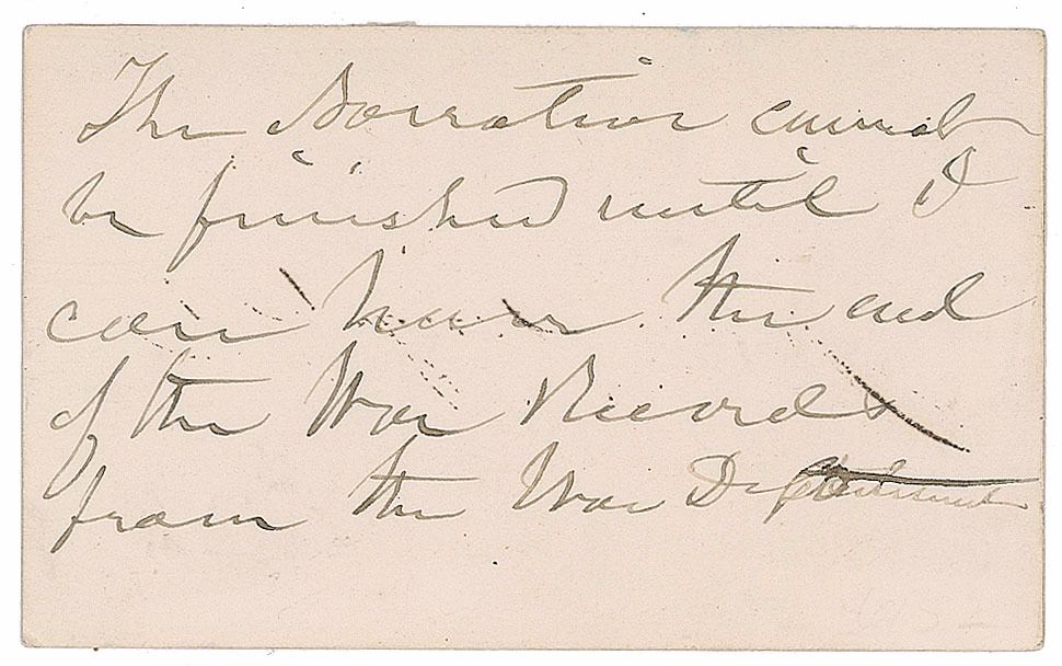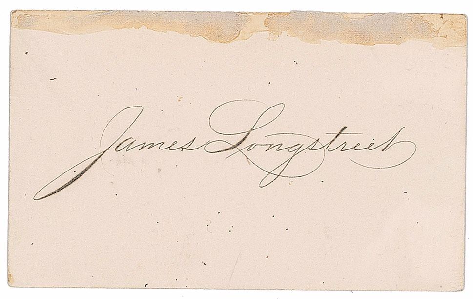 Handwritten note by Longstreet, unsigned, on the reverse of his personal calling card, 3.25 x 2, no date. In full: “The narrative cannot be finished until I can have the end of the War Records from the War Department.” In fine condition, with old mounting traces along the top of the front side.