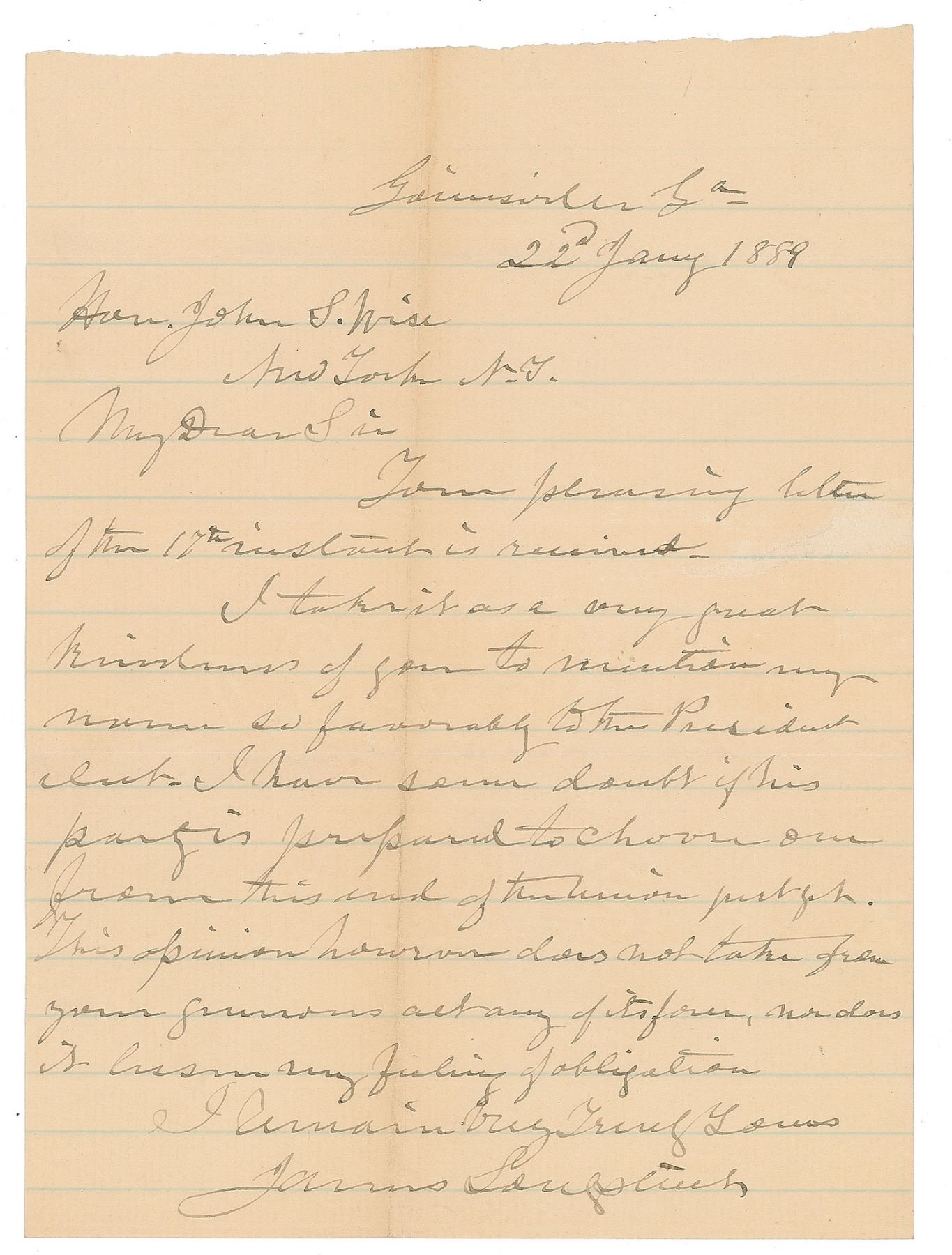 ALS, one page, 6 x 8, January 22, 1888. Letter to the Hon. John S. Wise in New York, in part: "Your pleasing letter of the 17th instant is received. I take it as a very great kindness of you to mention my name so favorably to the President elect. I have some doubt if his party is prepared to choose one from this end of the Union just yet. This opinion however does not take from your generous act any of its force, nor does it lessen my feeling of obligation." In fine condition, with an area of thin paper to right side.