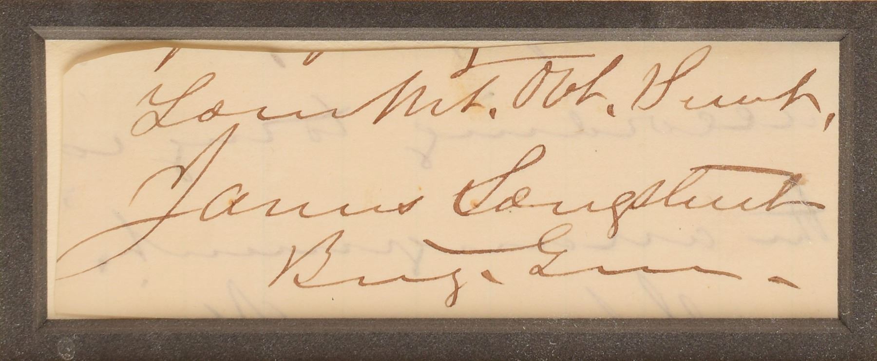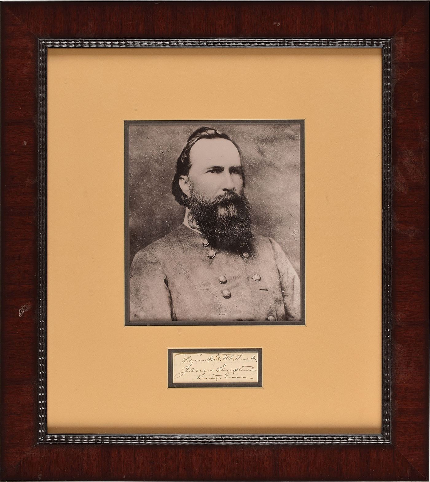 Ink signature, "Your Mt. Obt. Serv't, James Longstreet, Brig. Gen.,” on an off-white 3.5 x 1.25 slip clipped from a letter. Double-matted and framed with a portrait to an overall size of 17.25 x 19.25. In fine condition, with writing showing through from the reverse. Longstreet's autographs as brigadier general are rare, as he only held this rank for a few months in the beginning of the Civil War.