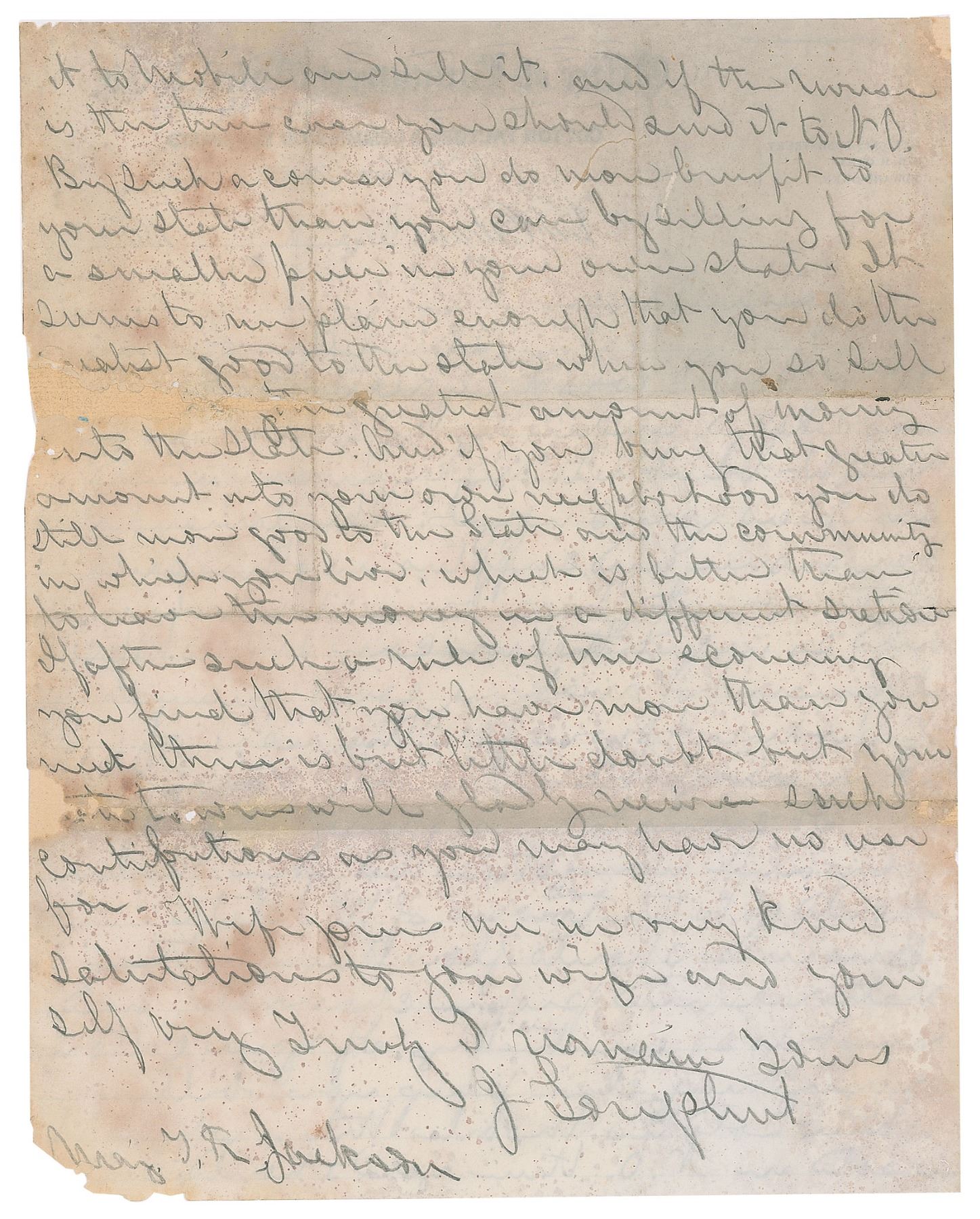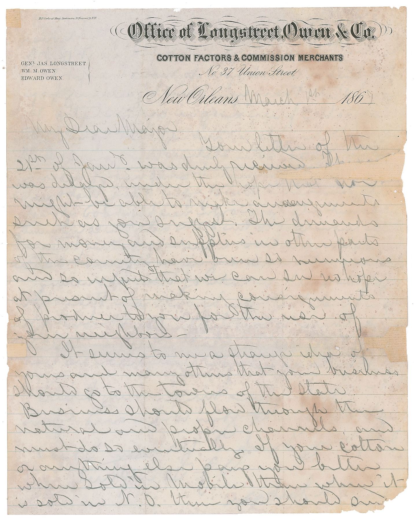 ALS in pencil, signed “J. Longstreet,” one page both sides, 8.25 x 10.5, Office of Longstreet, Owen & Co. letterhead, March 1, 1867. Letter of business to Major T. F. Jackson, in part: "The demands for money and supplies in other parts of the country have been so numerous and so unjust that we can see no hope at present of making consignments of produce to you for the use of your neighbors. It seems to me a strange idea of yours and many others that your business should go to the towns of the state. Business should flow through the natural and proper channels and must do so eventually. If your cotton or anything else pays you better when sold in Mobile than where it is sold in N. D., you should send it to Mobile and sell it." In very good condition, with staining and soiling, corner loss, and old repairs to tears and paper loss.