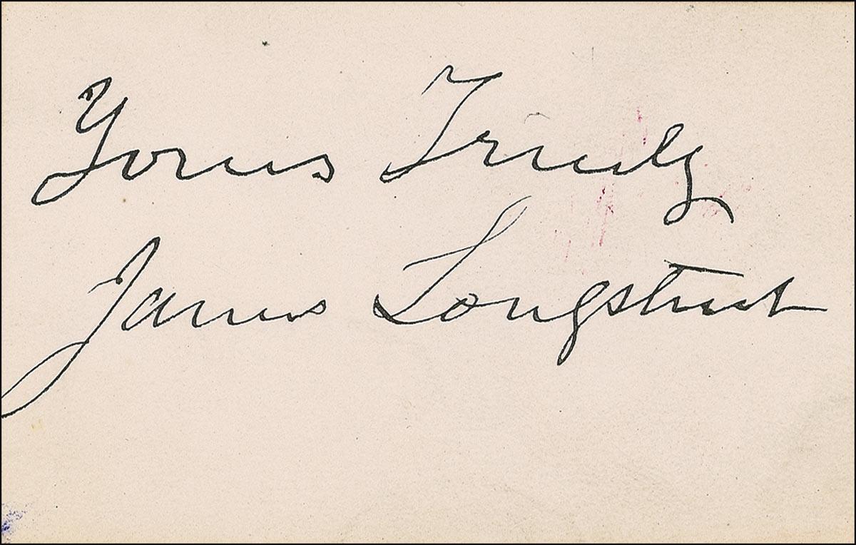 Ink signature, “Yours truly, James Longstreet,” on an off-white 3 x 1.75 card. A hint of faint soiling, and a few small scattered stains, otherwise fine condition. Pre-certified PSA/DNA and RRAuction COA.
