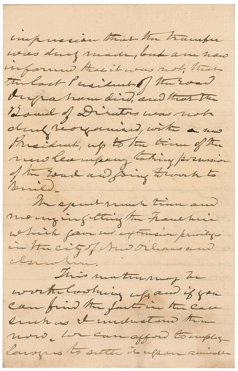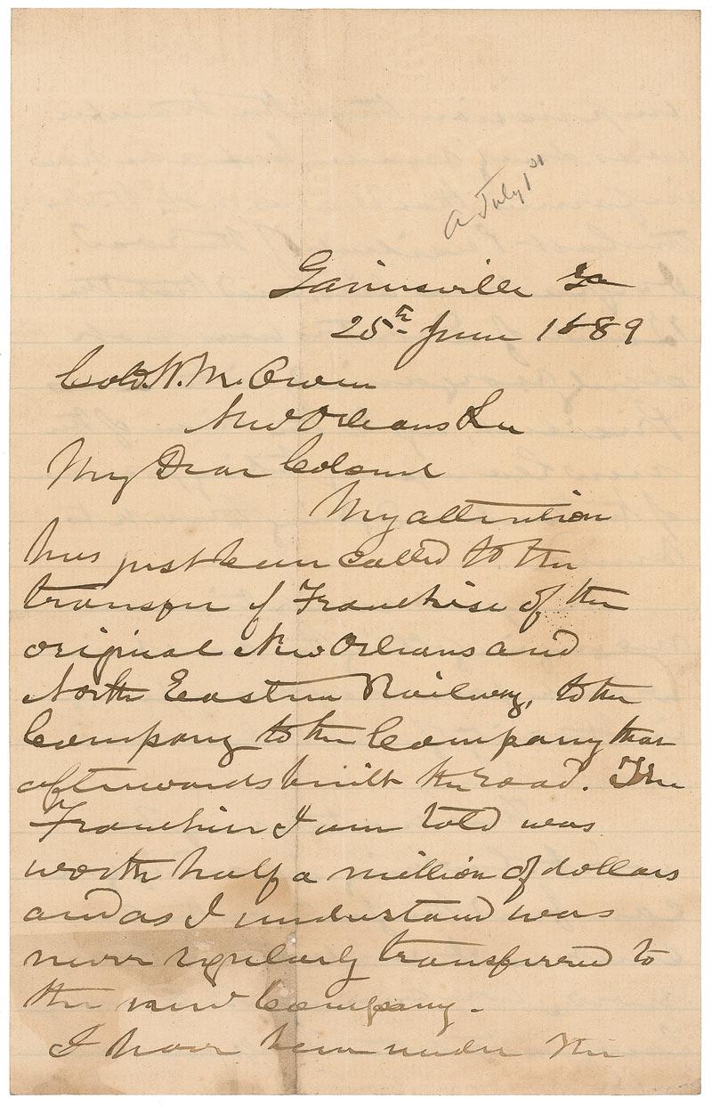 ALS, four pages on two lightly-lined sheets, 6 x 9.5, June 25, 1889. Letter to Colonel W. M. Owen. In part: “My attention has just been called to the transfer of Franchise of the original New Orleans and North Eastern Railway to the company that afterwards built the road. The Franchise I am told was worth half a million of dollars and as I understand was never regularly transferred to the new company. I have been under the impression that the transfer was duly made, but am now informed that it was not, that the last president of the road…has died, and that the Board of Directors was not duly reorganized with a new president, up to the time of the new company taking possession of the road and going to work to build.