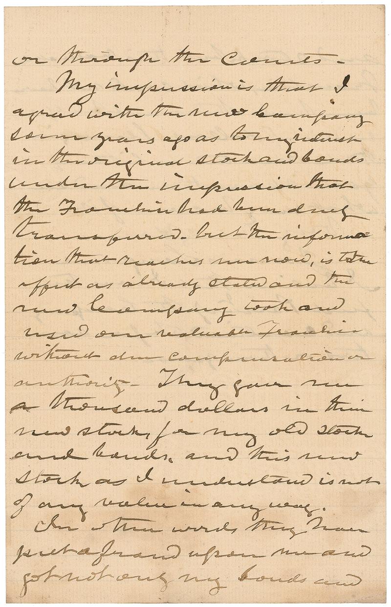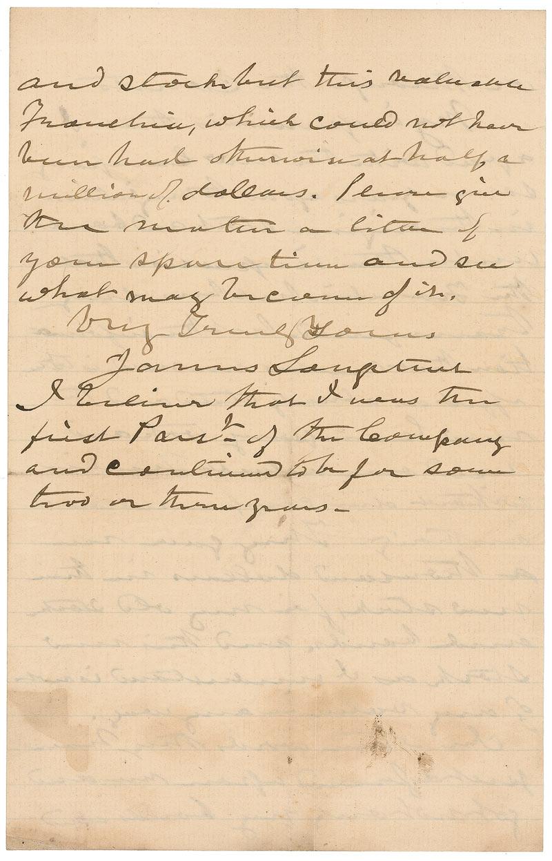 My impression is that I agreed with the new company some years ago as to my interest in the original stock and bonds under the impression that the Franchise had been duly transferred but the information that reaches me now, is the effect as already stated and the new company took and used our valuable Franchise without due compensation or authority. They gave me a thousand dollars in their new stock as I understand in not of any value in any way. In other words they have put a fraud upon me and got not only my bonds and stocks but this valuable Franchise, which could not have been had otherwise at half a million of dollars. Please give the matter a little of your spare time and see what may become of it.” Longstreet also adds a brief postscript, “I believe that I was the first Presdt. of the Company and continued to be for some two or three years.” In very good condition, with intersecting folds, including two vertical folds through signature, scattered toning (heaviest at bottom) and soiling, and a pencil notation to top of first page.