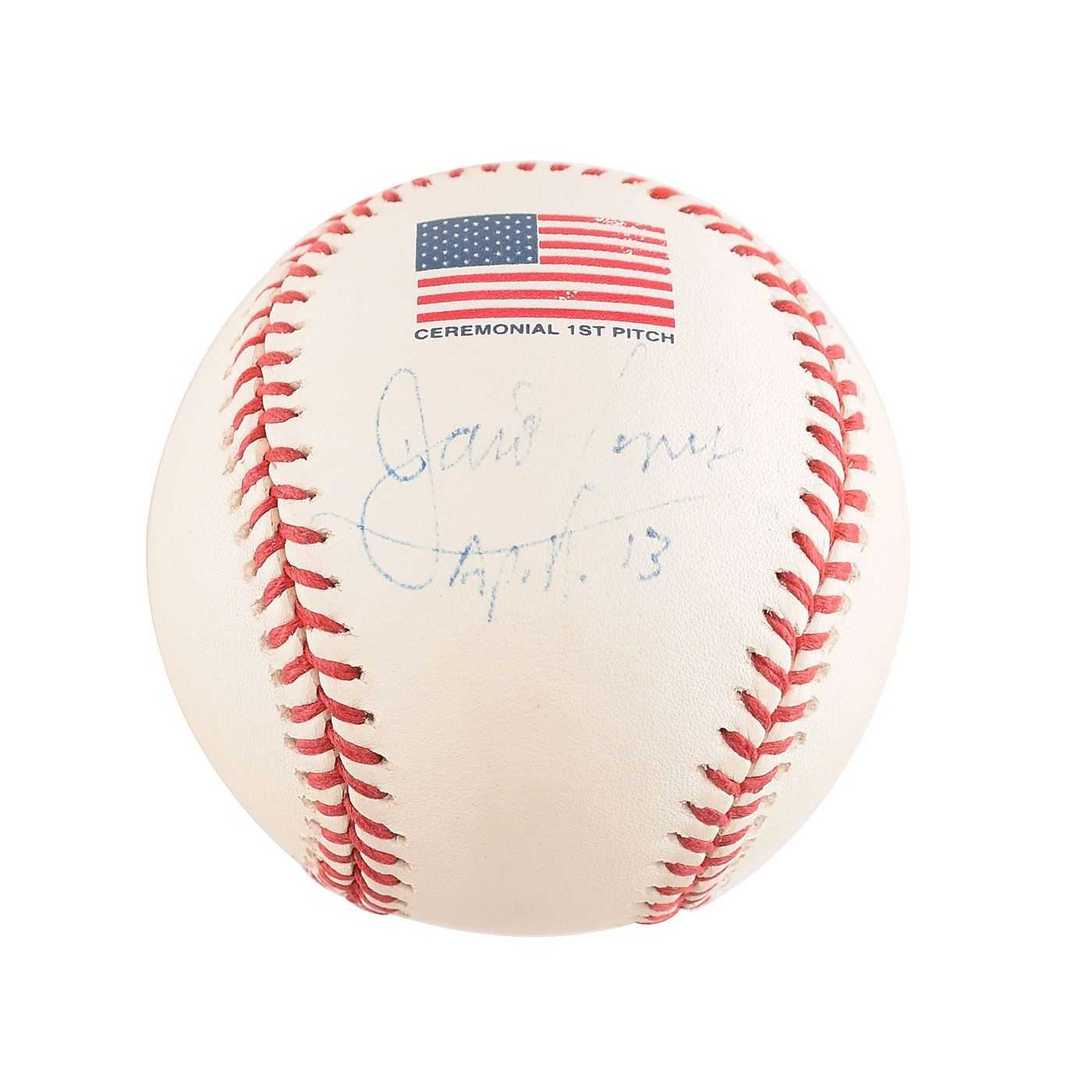 Official Rawlings 2001 World Series 'Ceremonial First Pitch' (Selig) baseball signed on a side panel in blue ink, "James Lovell, Apollo 13," who adds an inscription on the opposite side panel, "To Anne & Phil." In fine condition, with the signature a bit on the light side.