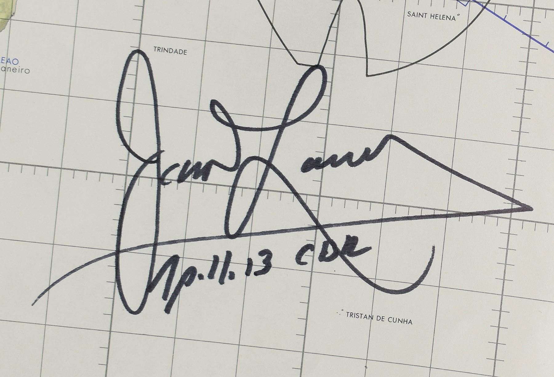 Highly desirable color first edition of the Apollo 13 Earth Orbit Chart, 41 x 13.5, dated March 3, 1970, signed on the left side in black felt tip, "James Lovell, Apollo 13 CDR." Titled in the lower right corner, "Apollo Earth Orbit Chart (AEO), Apollo Mission 13, For April 1970 Launch Date." In fine condition, with three vertical folds and some light edge creasing. An outstanding oversized piece signed by the Apollo 13 commander.