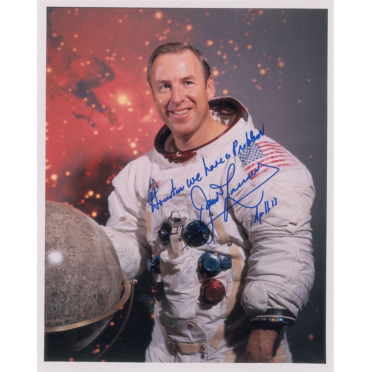 Color satin-finish 8 x 10 photo of Lovell in his white space suit next to a globe model of the moon, signed in blue felt tip, “Houston we have a problem, James Lovell, Apollo 13.” In fine condition.