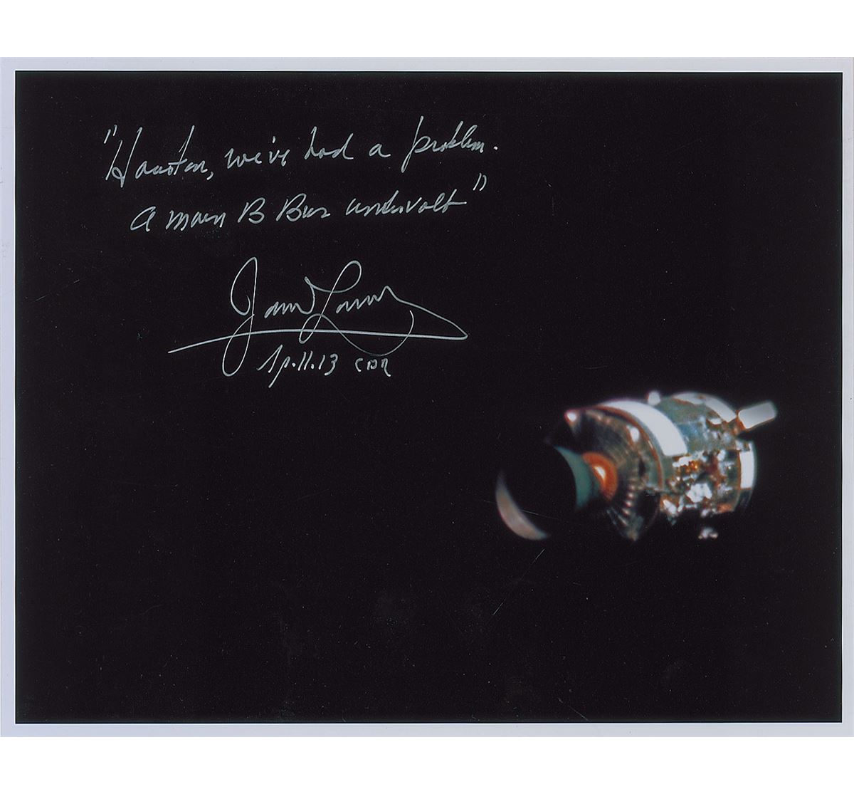 Color satin-finish 10 x 8 photo of the damaged Apollo 13 service module floating in space, signed in silver ink, “’Houston, we’ve had a problem. A main B Bus undervolt,’ James Lovell, Apollo 13 CDR.” In fine condition. A poignant image further enhanced by Lovell’s wonderful inscription.