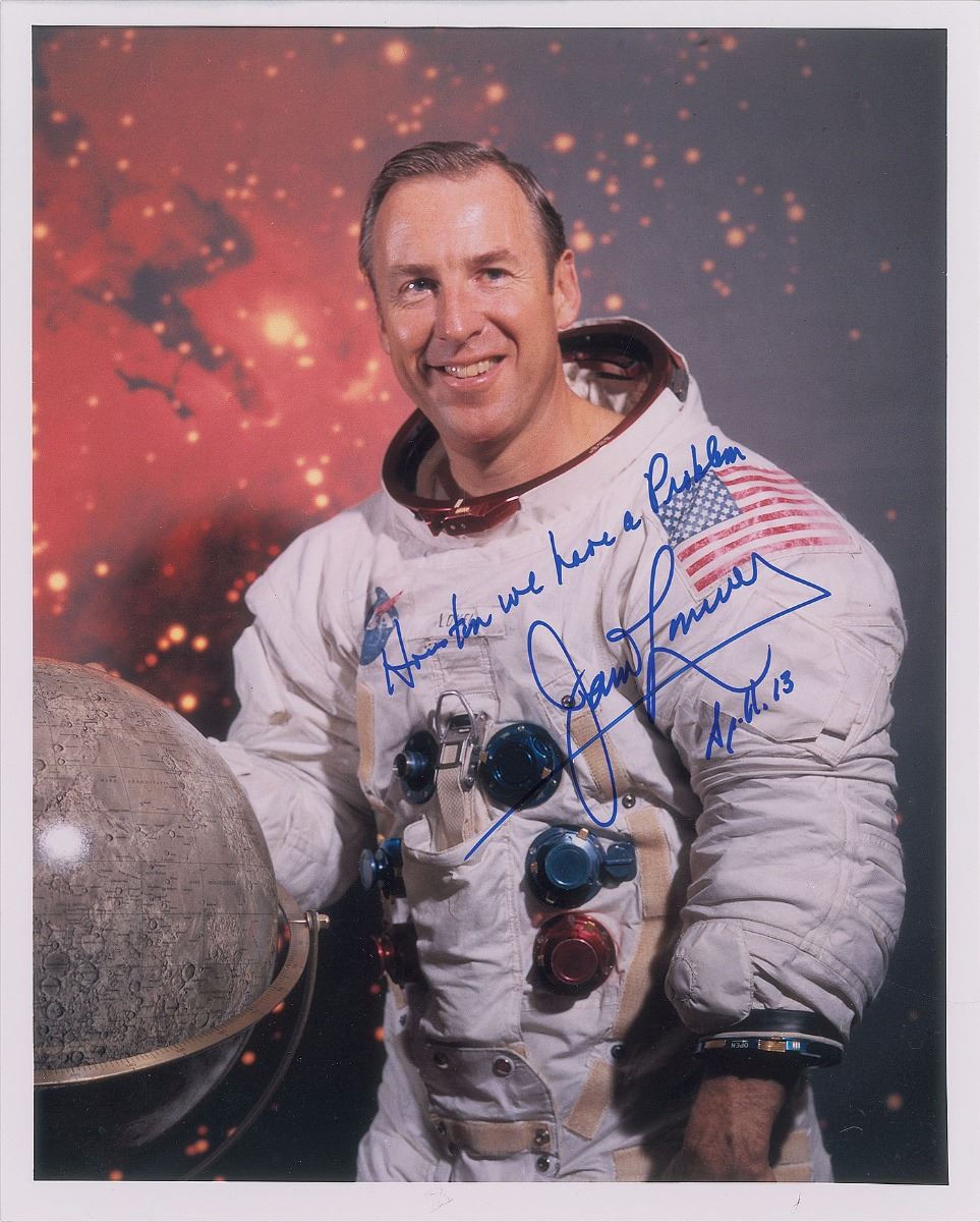 Color semi-glossy 8 x 10 photo of Commander Lovell posing in his white space suit with a lunar globe, signed in blue felt tip, "Houston we have a Problem, James Lovell, Apollo 13." In fine condition. Pre-certified Zarelli Space Authentication.