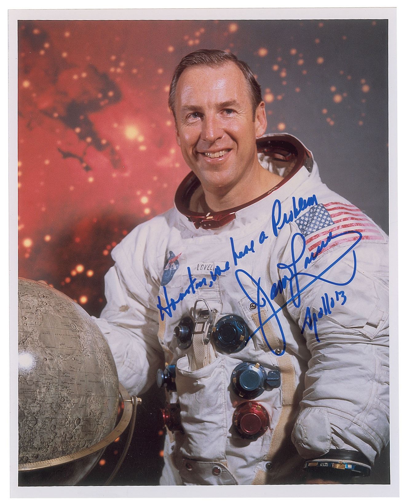 Color semi-glossy 8 x 10 photo of Lovell in his white space suit posing with a lunar globe, signed in blue felt tip, "Houston we have a problem, James Lovell, Apollo 13." In fine condition.