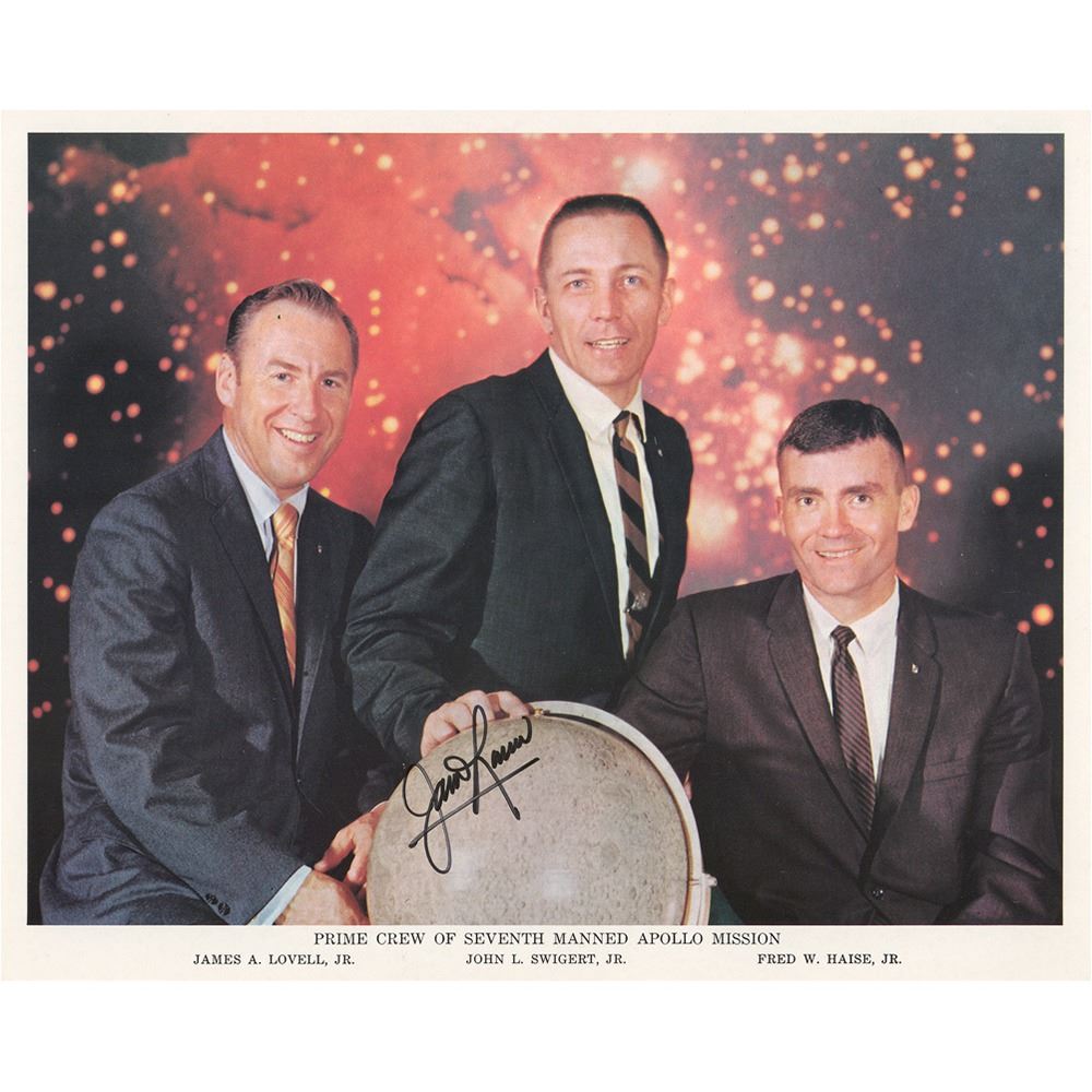Official color 10 x 8 NASA lithograph of the Apollo 13 crew posing together after their harrowing mission, signed in black felt tip by James Lovell. In fine condition.