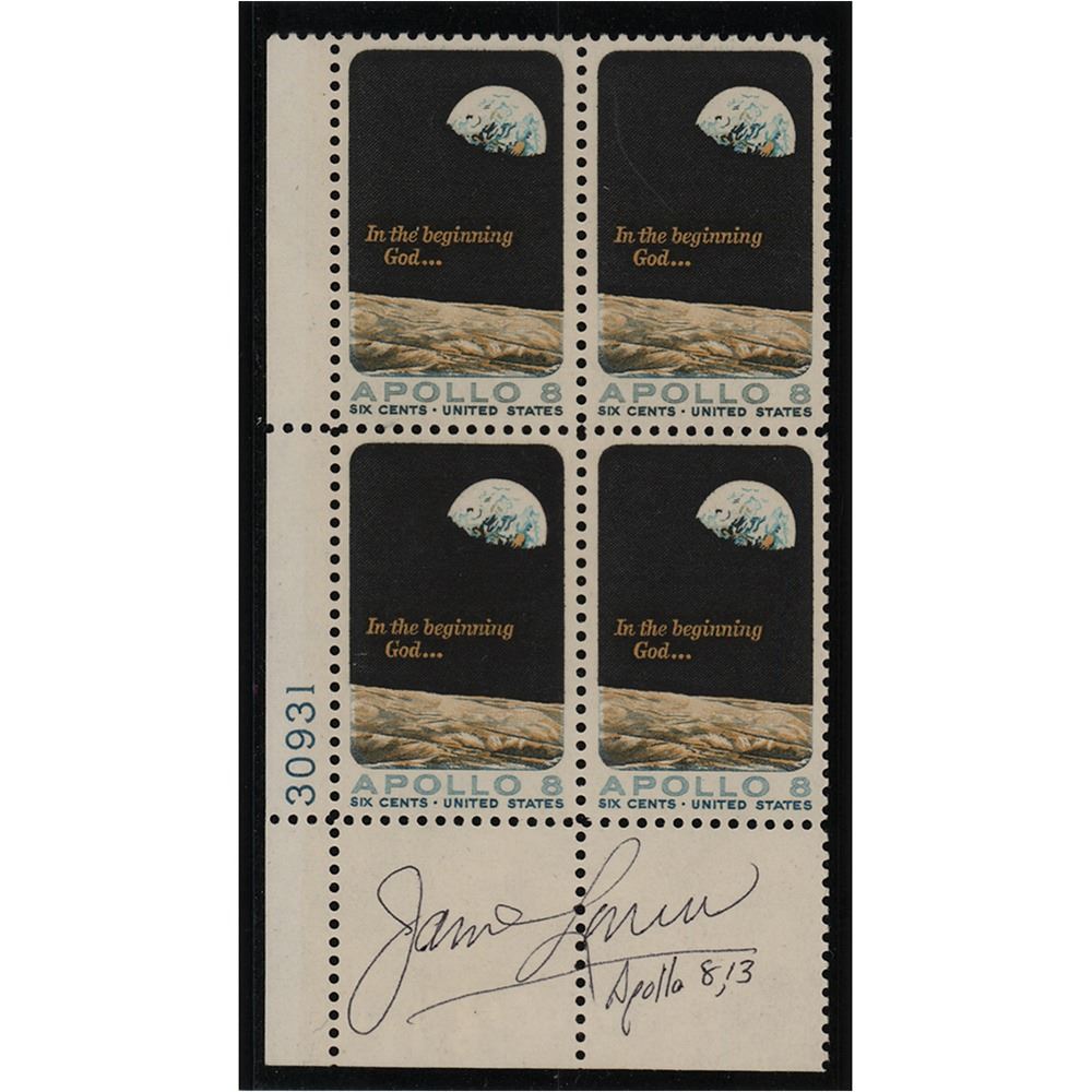 Appealing block of four six-cent postage stamps featuring the iconic Apollo 8 'Earthrise' image, signed in the lower border in black ballpoint, "James Lovell, Apollo 8, 13." In very fine condition.