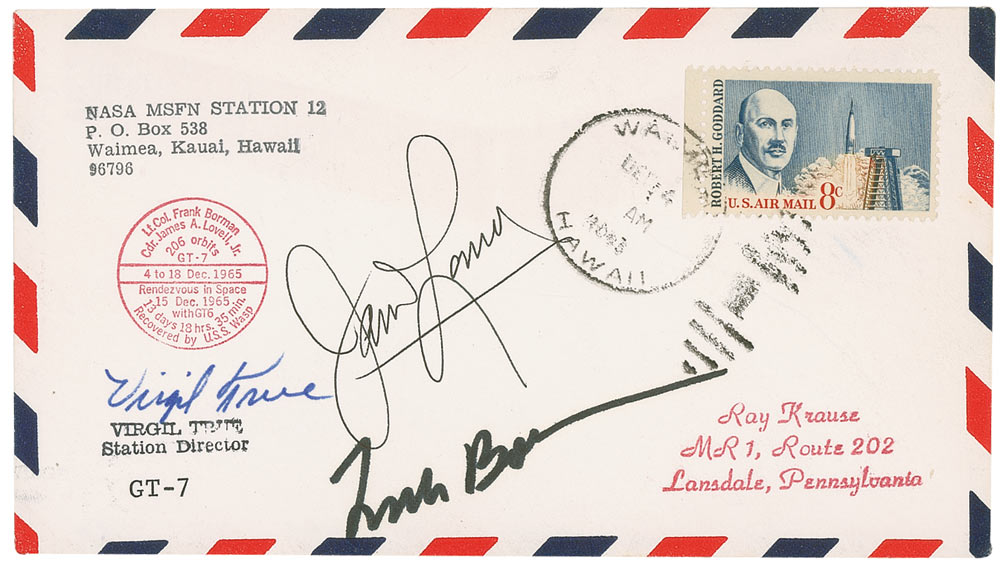 Commemorative airmail cover, 6.5 x 3.5, 1965, with a stamped cachet honoring the Gemini 7 mission, signed in various inks by James Lovell, Frank Borman, and station director Virgil True. Recipient’s stamped name at lower right, otherwise fine, clean condition.