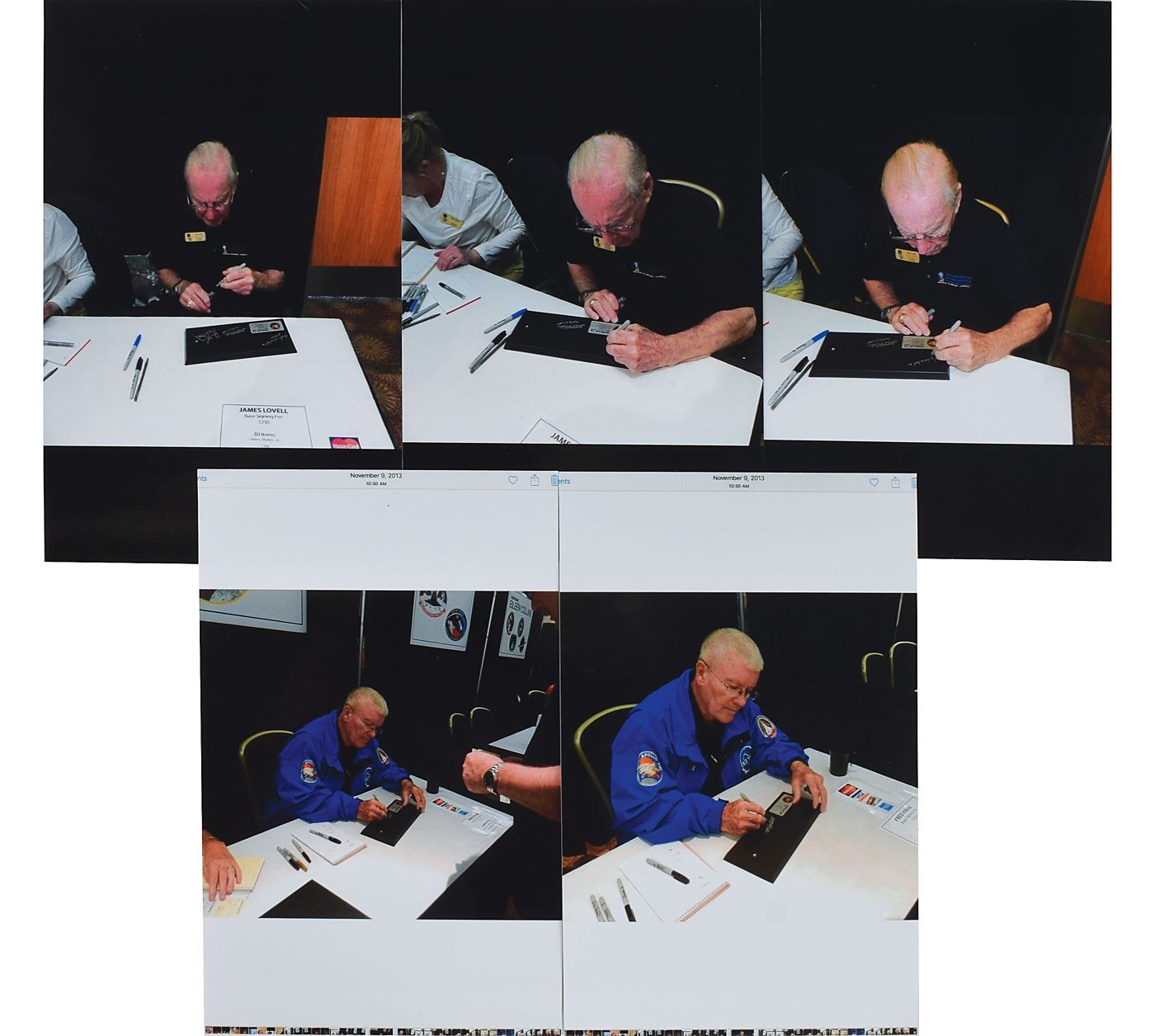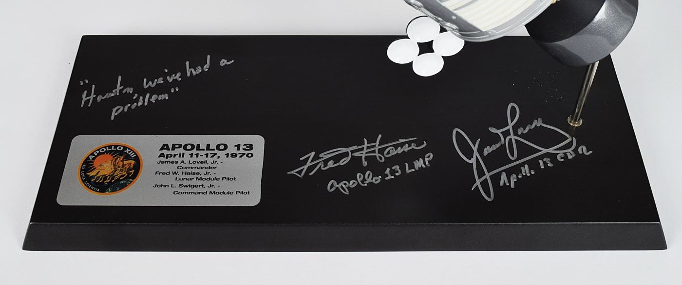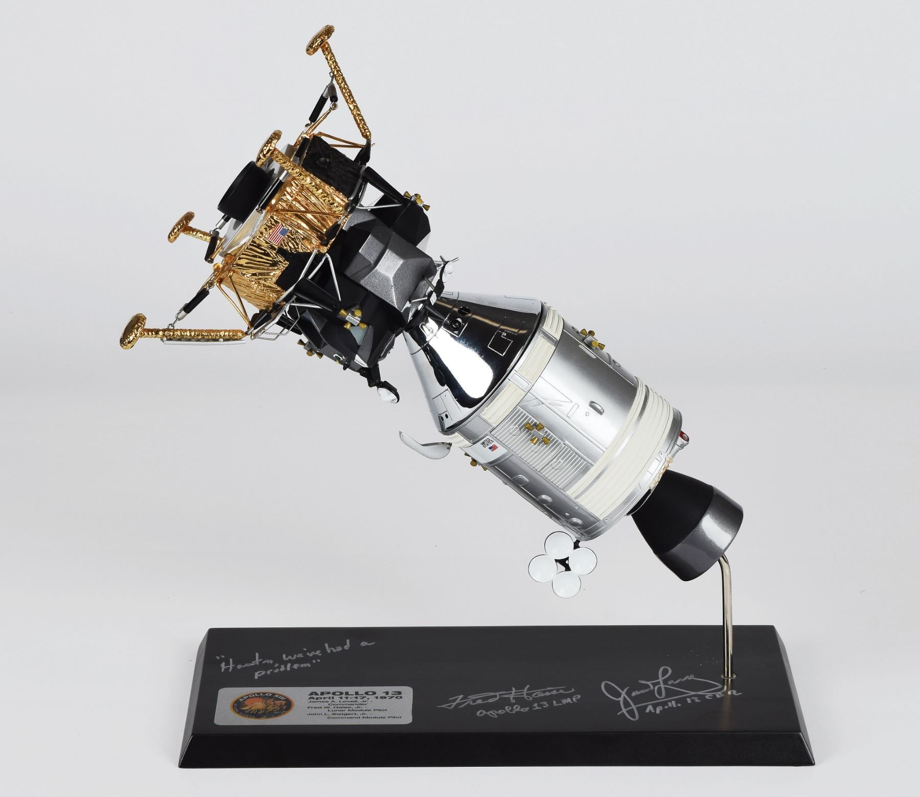Gorgeous 1:50 scale model replica of the Apollo 13 Command Module Odyssey and Lunar Module Aquarius by The Danbury Mint. This intricately crafted and hand-painted replica separates into four individual components and, when docked altogether, approximately measures 5.75 x 13 x 16; when displayed on the 12.75 x 5.75 wooden base, the model reaches an impressive 13.75? in height. The base is signed in silver ink: "Fred Haise, Apollo 13 LMP" and "James Lovell, Apollo 13 CDR," who adds in the upper left: "'Houston, we've had a problem.'" In fine condition. Accompanied by the original box and certificate from The Danbury Mint, as well as photos of Haise and Lovell taken at the time of signing.