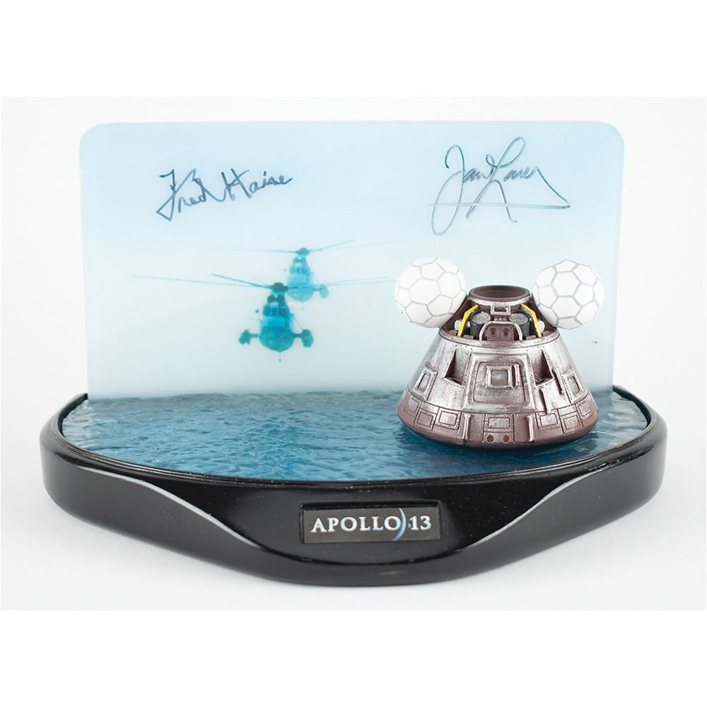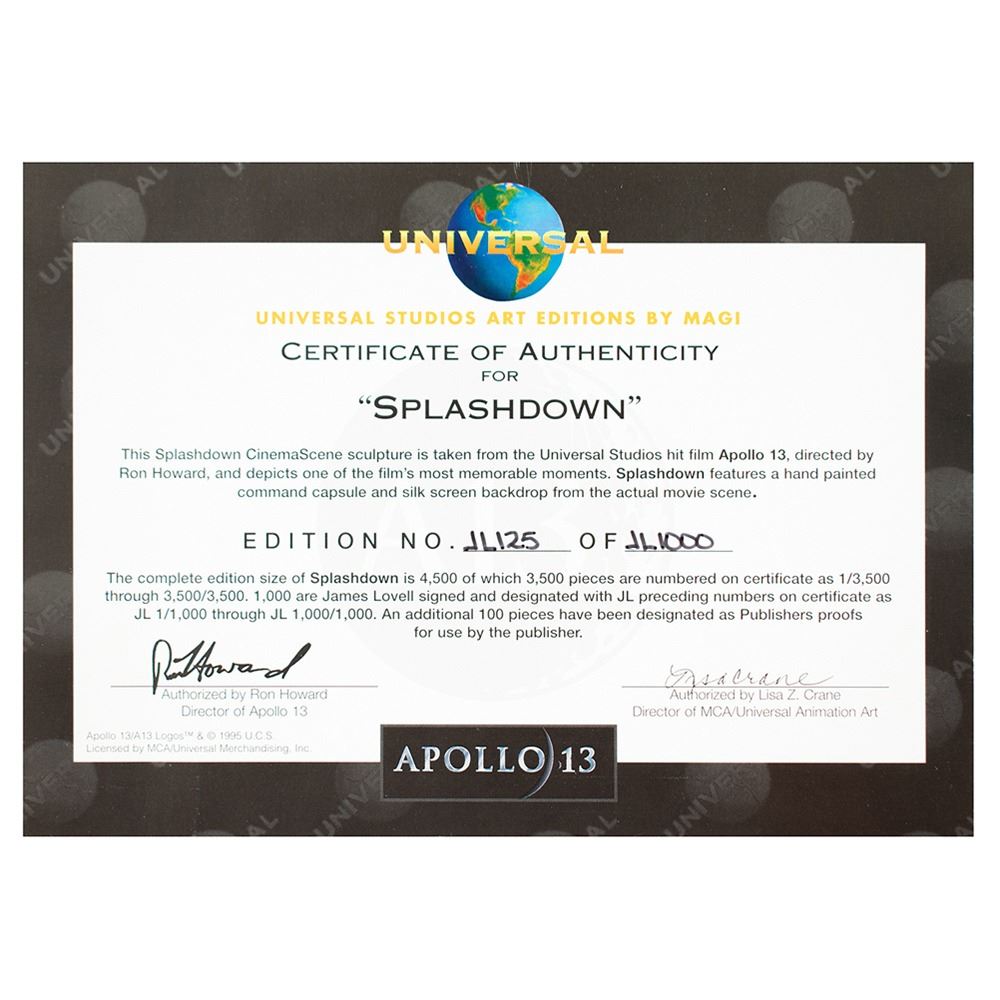 Limited edition CinemaScene sculpture for the 1995 film Apollo 13 entitled ‰Û÷Splashdown,‰Ûª made by Universal Art Editions by Magi, numbered JL125 of JL1000, measuring 9 x 5.5 x 5, featuring an oceanic resin base and a silkscreened backdrop of two rescue helicopters, which is signed in black felt tip by James Lovell and Fred Haise. The scene includes a hand-painted command module. In very good to fine condition, with a crack to oceanic base, scuffs to backdrop, and a missing righting sphere to the CM. Accompanied by a full letter of authenticity from Zarelli Space Authentication and by a certificate of authenticity from Universal Art Editions, which bears a preprinted signature of Ron Howard.