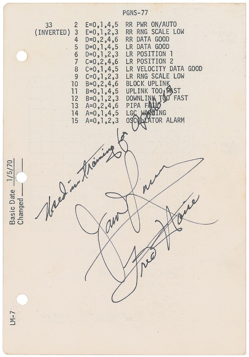 Double-sided page removed from the Apollo 13 Lunar Module Flight Crew G & N Dictionary, 5.5 x 8, with a basic date of January 5, 1970, and a changed date of January 18, 1970, signed on one side in black felt tip, "Used in training for Apollo 13, Fred Haise" and "James Lovell." Consisting of pages 77 and 78, the front shows the final step for a "Channel Listing" section, noting instructions for inverted 33; the reverse side, headed above "LM OR CSM S. V. READOUT," and below, "LM OR CSM S.V. LOADING," lists various code steps: "V83E," "After integration: V05N01E," and "Transmit S.V. & Time Tag To CSM." In fine condition. Originating from the Astronaut Scholarship Foundation, a portion of the proceeds for the sale of this item will be donated to the ASF.