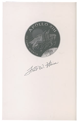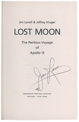 Signed book: Lost Moon. First edition. NY: Houghton Mifflin Company, 1994. Hardcover with dustjacket, 6.25 x 9.25, 378 pages. Signed in black ballpoint on the title page by James Lovell and on the adjacent page by Fred Haise. In fine condition.