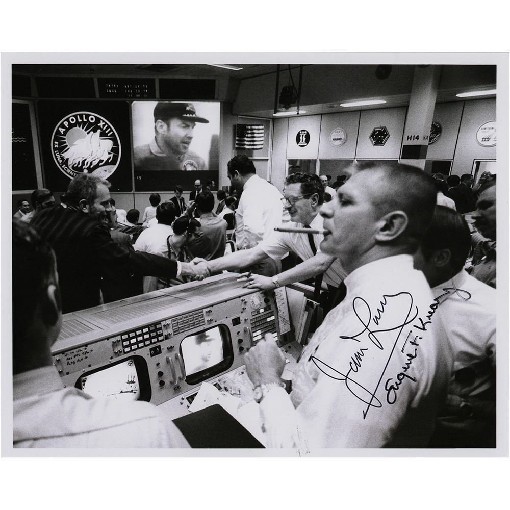 Satin-finish 10 x 8 photo of flight director Gene Kranz lighting up a celebratory cigar as he watches CDR James Lovell on a monitor after the Apollo 13 recovery, signed in black felt tip, "James Lovell" and "Eugene F. Kranz." In very fine condition.
