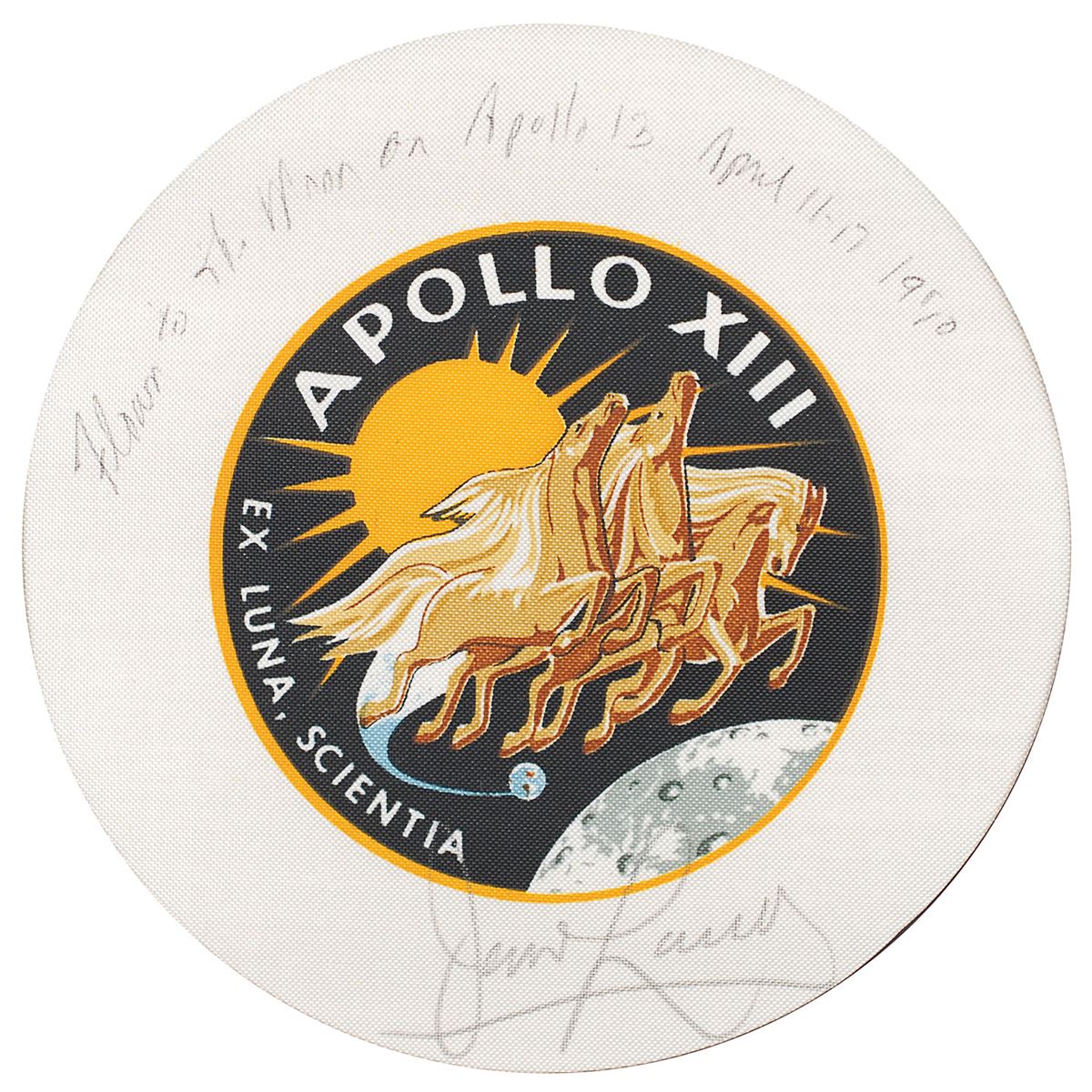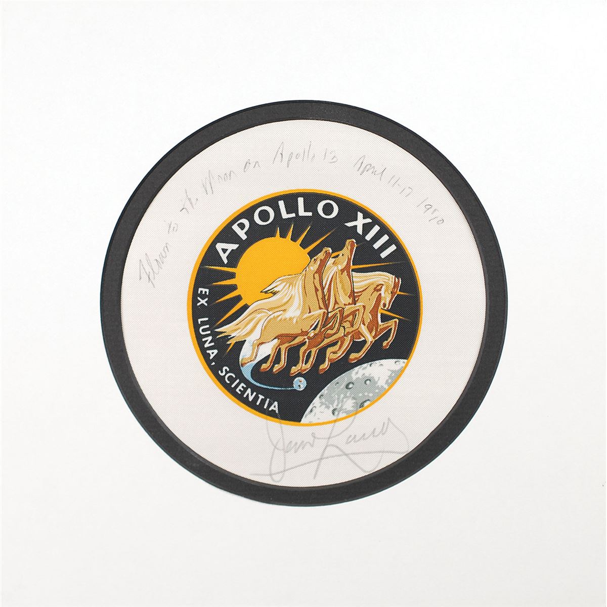 Flown circular 5? diameter swatch of Beta cloth bearing a 3.5? diameter mission insignia in the center, signed and flight-certified around the emblem in black ink, “Flown to the Moon on Apollo 13, April 11–17, 1970, James Lovell.” Double-matted to an overall size of 9 x 9. A pre-printed certificate of authenticity from Lovell is affixed to the reverse of the mat, stating that it was one of 450 patches listed in the Commander’s Personal Preference kit, and located in pouch part number SEB32100025-301, serial number 1016. In fine condition. A wonderful example desirably certified directly on the piece by the Apollo 13 commander.