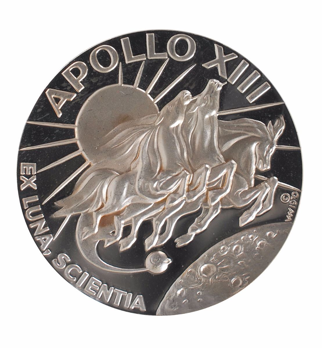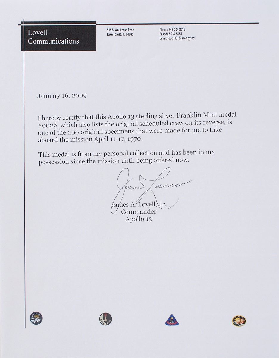Unflown Apollo 13 sterling silver medallion struck by the Franklin Mint, approximately 1.5? in diameter, with a raised design of the mission insignia on the face and depictions of the Odyssey and Aquarius spacecraft encircled by the original astronauts’ names on the reverse. The medal is serial numbered “0026” and stamped “Sterling” on the edge. Encapsulated in a plastic NGC holder and graded PF64 Ultra Cameo, also noting that it originates from the collection of James Lovell. Accompanied by a signed letter of provenance from Apollo 13 Commander Jim Lovell, in part: “I hereby certify that this Apollo 13 sterling silver Franklin Mint medal #0026…is one of the 200 original specimens that were made for me to take aboard the mission…This medal is from my personal collection and has been in my possession since the mission.”