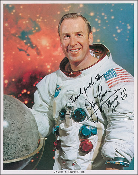 Inspirational color 8 x 10 NASA photo of Lovell posing in his space suit, signed in black felt tip “Reach for the Stars. James Lovell, Gemini 7, 12, Apollo 8, 13.” In fine condition.
