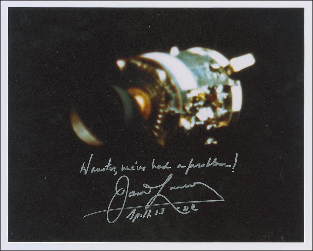 Color satin-finish 10 x 8 photo of the damaged Apollo 13 service module, signed in silver ink, “Houston, we’ve had a problem! James Lovell, Apollo 13 CDR.” In very fine condition.