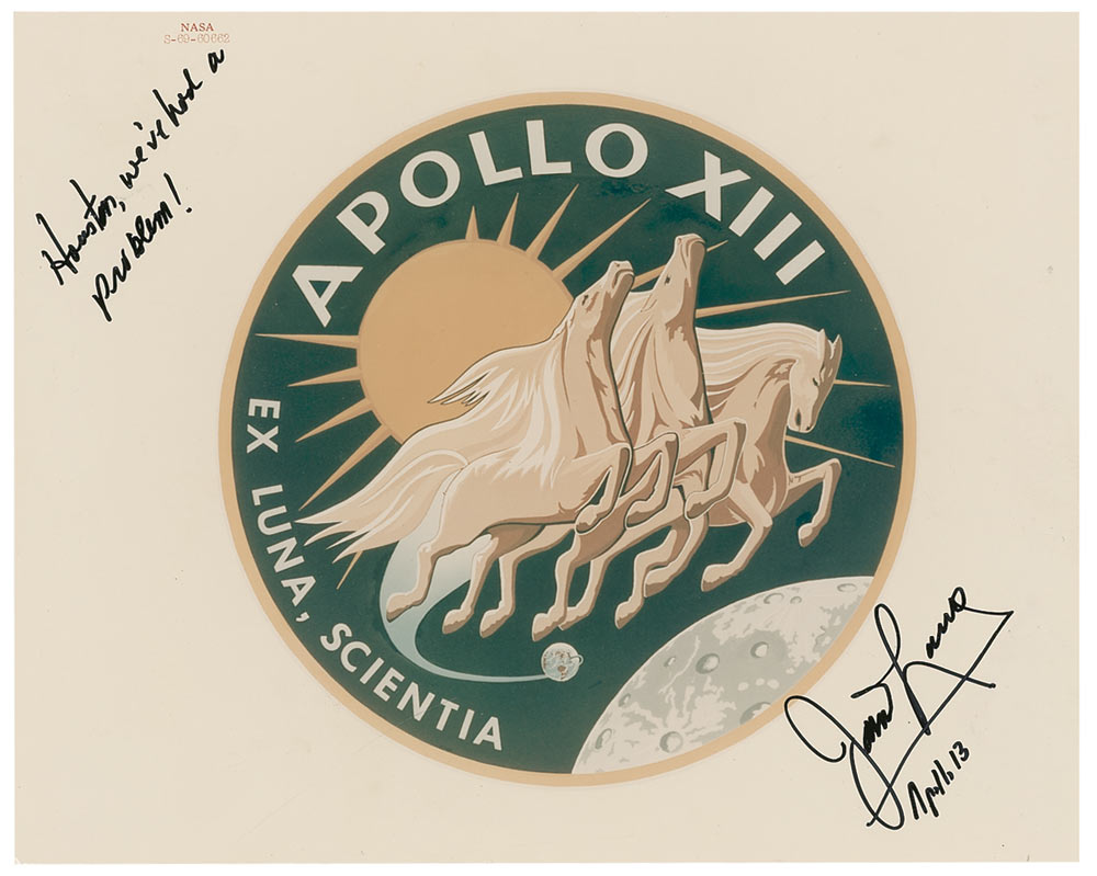 Color glossy 10 x 8 ‘red-numbered’ NASA photo of the Apollo 13 insignia, signed in black felt tip, “Houston, we’ve had a problem! James Lovell, Apollo 13.” In very fine condition. The Apollo 13 insignia is one of two Apollo insignia—the other being Apollo 11—which does not incorporate the names of the crew. This was fortunate, considering that original crew member Ken Mattingly was replaced two days before the mission began.