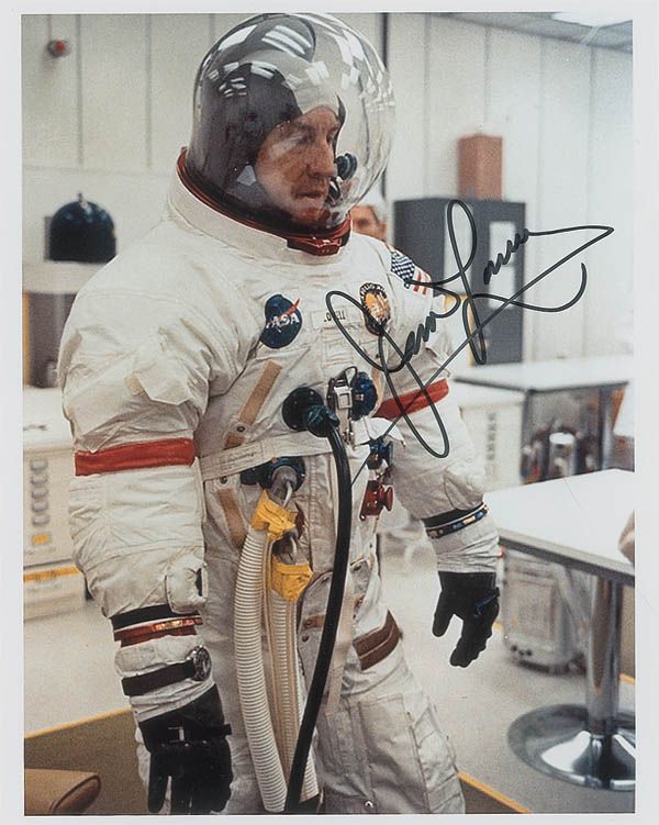 Color satin-finish 8 x 10 photo of Lovell in his Apollo 13 space suit, signed in black felt tip. In very fine condition.