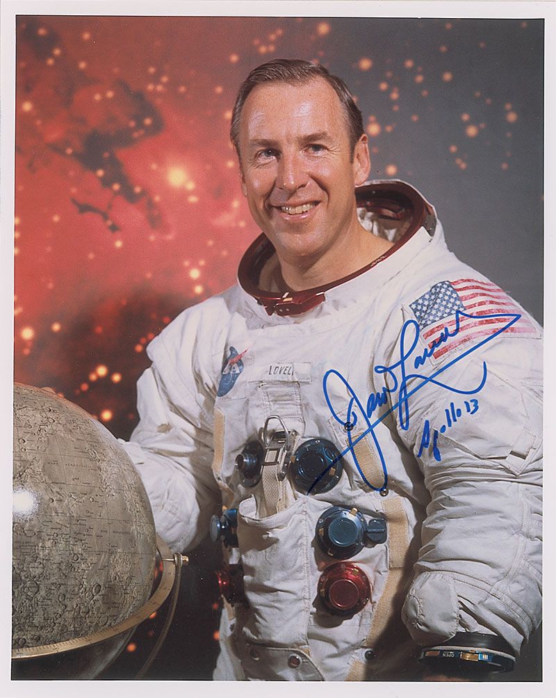 Color satin-finish 8 x 10 photo of Lovell posing in his white space suit against a celestial background, signed in blue felt tip, “James Lovell, Apollo 13.” In very fine condition.