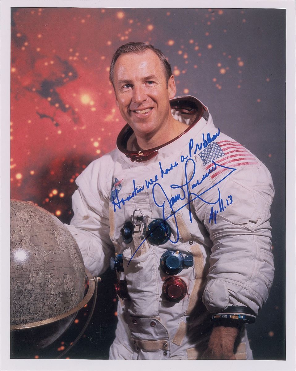 Color semi-glossy 8 x 10 photo of Lovell posing in his white space suit against a celestial backdrop, signed in blue felt tip, “Houston we have a problem, James Lovell, Apollo 13.” In very fine condition.