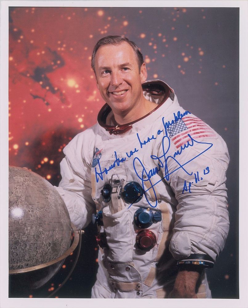Color semi-glossy 8 x 10 photo of Lovell in his white space suit posing with a lunar globe, signed in blue felt tip, "Houston we have a problem, James Lovell, Apollo 13." In very fine condition.