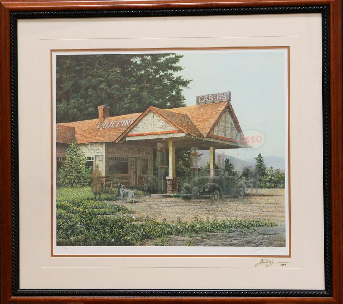 James Lumbers' "Lone Pine" limited edition framed print signed and numbered 818/950. This has been professionally double matted using acid free matting, and has been custom framed under glass. James Lumbers has signed the glass. Image- 18 3/4" x 22". Frame- 30" x 33"