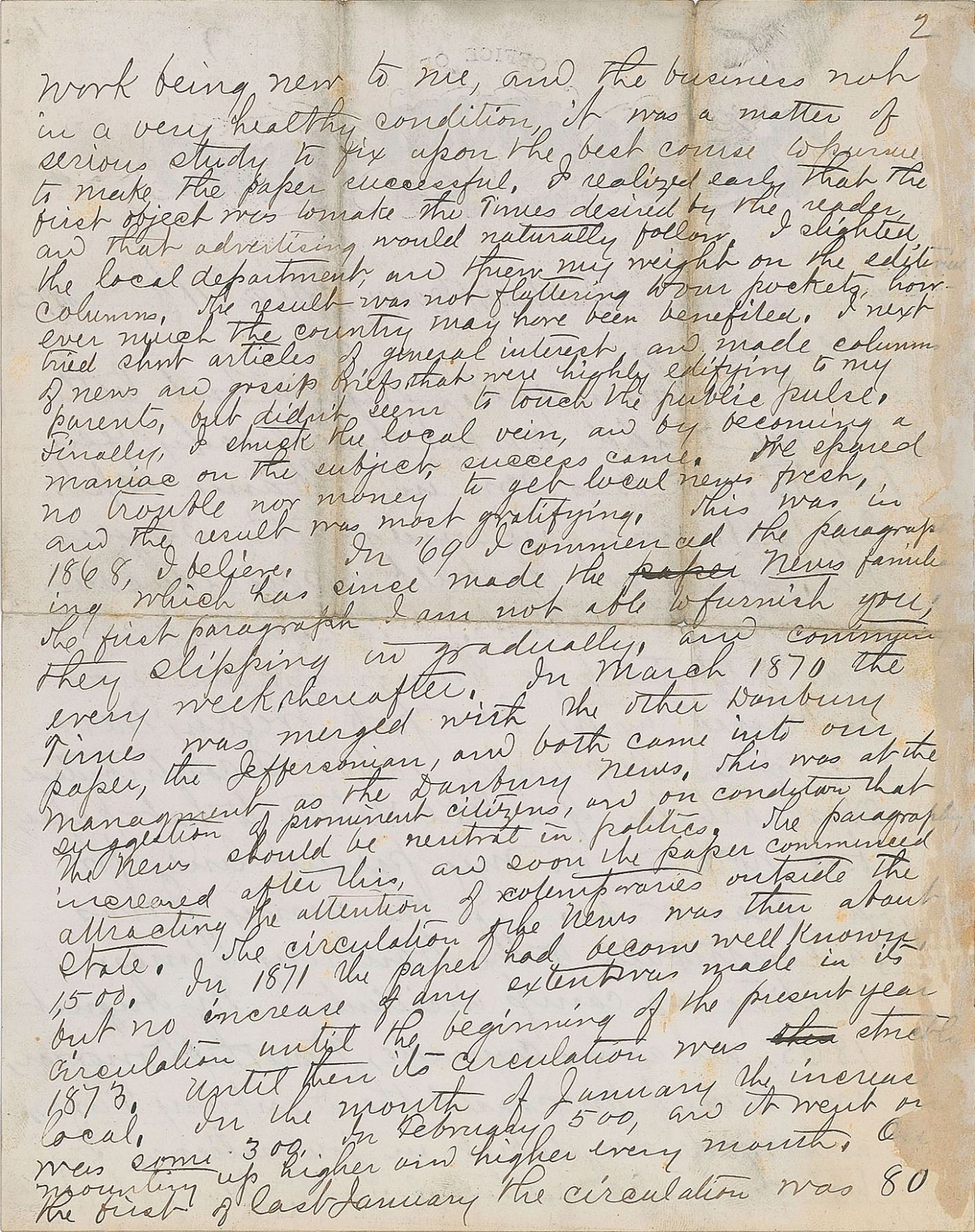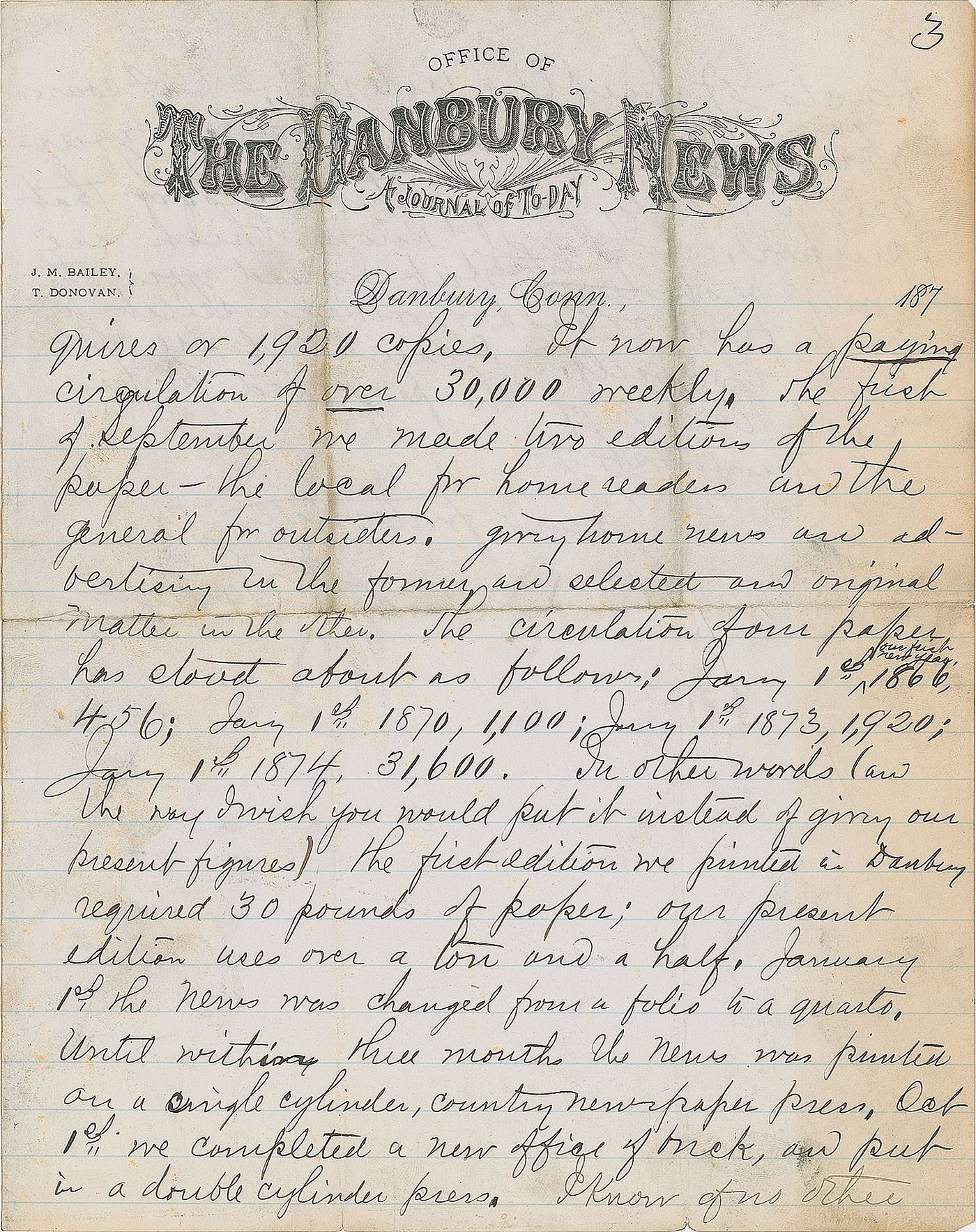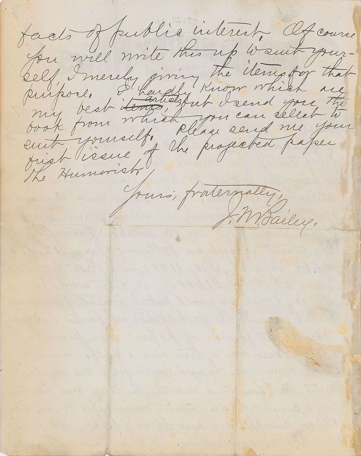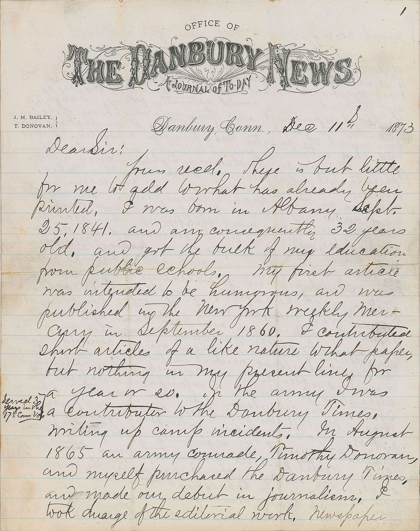 American journalist (1841–1894) who served in the Civil War and established the Danbury News. ALS signed “J. M. Bailey,” two pages both sides, 8 x 10, Office of The Danbury News letterhead, December 11, 1873. An autobiographical letter discussing the history of his newspaper, which became famous for its wit and humorous presentation of both real and fictitious news items. In part: "There is but little for me to add to what has already been printed. I was born in Albany Sept. 25, 1841, and am consequently 32 years old, and got the bulk of my education from public schools. My first article was intended to be humorous, and was published in the New York Weekly Mercury in September 1860. I contributed short articles of a like nature to that paper, but nothing in my present line, for a year or so. In the army (served 3 years in the 17th Conn. Vols), I was a contributor to the Danbury Times, writing up camp incidents. In August 1865 an army comrade, Timothy Donovan, and myself purchased the Danbury Times, and made our debut in journalism. I took charge of the editorial work. Newspaper work being new to me, and the business not in a very healthy condition, it was a matter of serious study to fix upon the best course to pursue to make the paper successful. I realized early that the first object was to make the Times desired by the reader, and that advertising would naturally follow. I slighted the local department, and threw my weight on the editorial columns. The result was not flattering to our pockets, however much the country may have been benefited. I next tried short articles of general interest and made columns of news and gossip briefs that were highly edifying to my parents, but didn't seem to touch the public pulse. Finally, I struck the local vein, and by becoming a maniac on the subject, success came. We spared no trouble nor money to get local news fresh, and the result was most gratifying. This was in 1868, I believe. In '69 I commenced the paragraphing which has since made the News familiar." He goes on to discuss the circulation numbers of his newspaper and its production process. In very good condition, with soiling, light staining, and old mounting residue along edges.