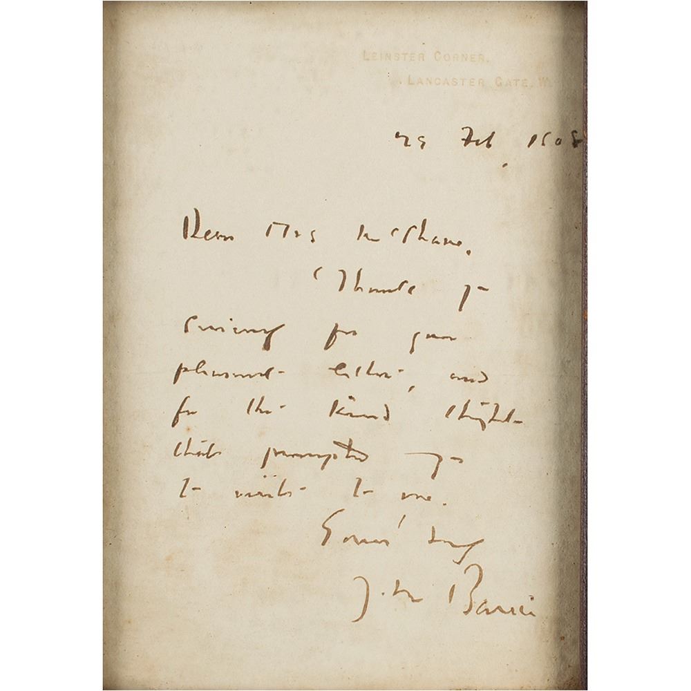 ALS signed “J. M. Barrie,†one page, 4 x 5.75, Leinster Corner letterhead, February 29, 1908. Handwritten letter from a rare leap-year date, in part: "Thank you…for your pleasant letter, and for the kind thoughts that prompted you to write to me." Framed beside an original cabinet photo of the author to an overall size of 9.75 x 7.75. In very good to fine condition, with soiling to the letter, a heavy stain to the lower right corner of the photo, and wear to the original old frame.