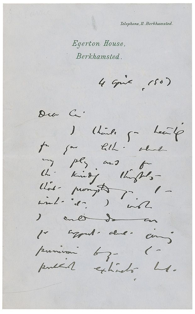 Scottish author and dramatist (1860–1937) best known for the classic children’s play Peter Pan. ALS signed “J. M. Barrie,” one page both sides, 5 x 8, Egerton House letterhead, April 4, 1907. Letter of thanks in Barrie’s difficult to decipher hand. In part: “I thank you heartily for your letter about my play and for the kind thoughts that prompted you to write it. I wish I could do as you suggest about giving permission…to publish exhibits.” Scattered creases, some light toning, and a light brush to signature, otherwise fine condition.
