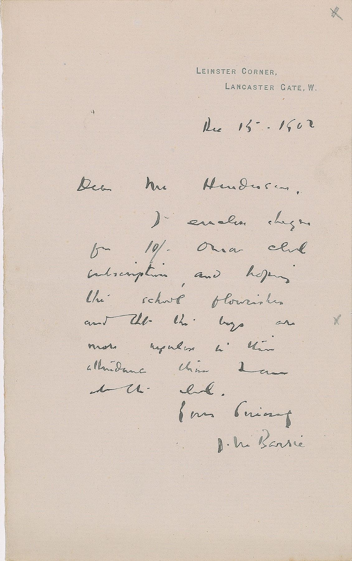Two ALSs signed "J. M. Barrie," each one page, dated 1901–1902, both to John Henderson, secretary of the National Liberal Club. The first, on Black Lake Cottage letterhead, May 17, 1901, in part: "Foiled again! I am down here but his is no excuse for not answering sooner." The second, on Leinster Corner letterhead, December 15, 1902, in part: "I enclose cheque for 10/— Omar club subscription, and hoping the school flourishes." In overall fine condition.