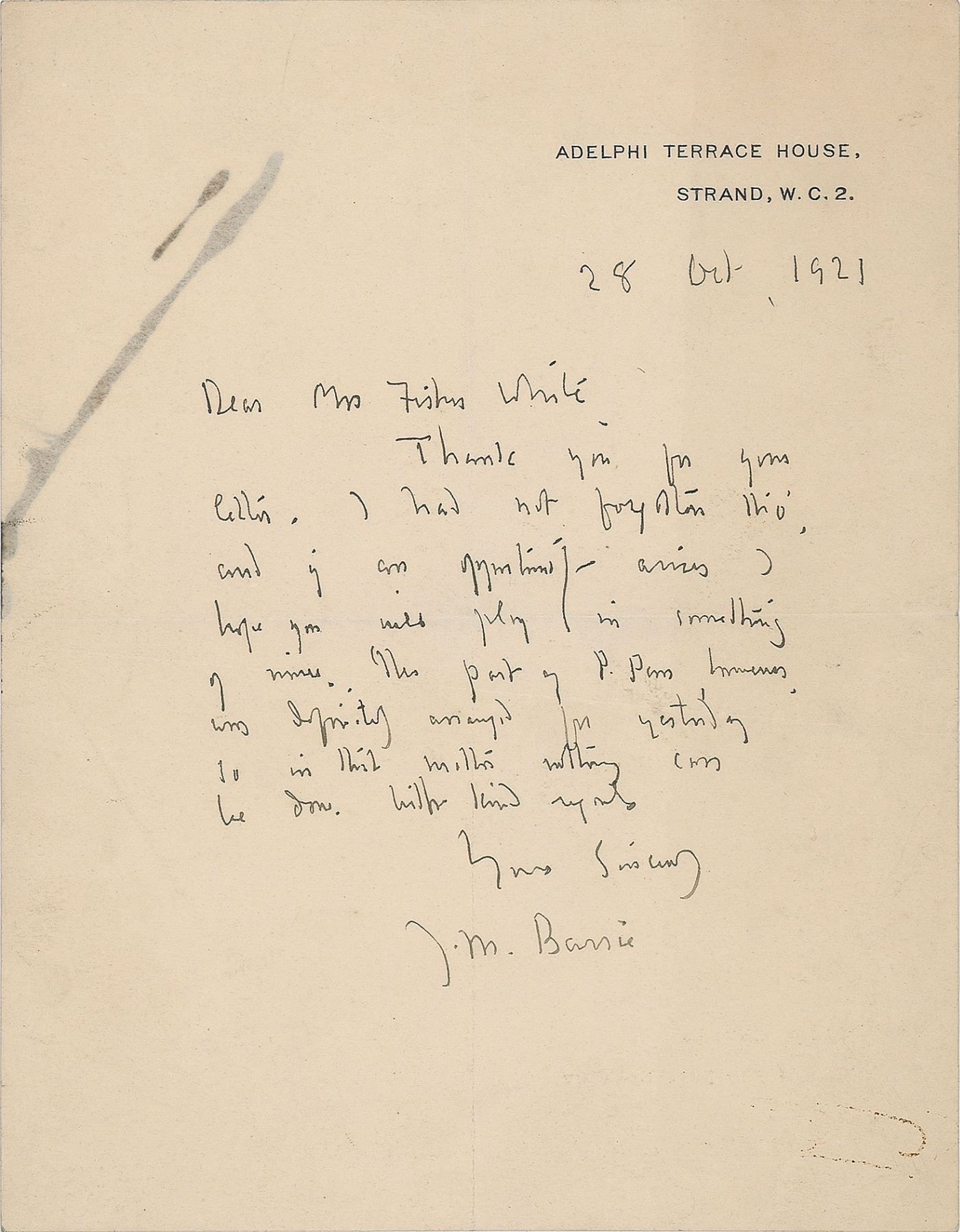 Scottish novelist and playwright (1860–1937) best remembered as the creator of Peter Pan. ALS signed “J. M. Barrie,” one page, 5.5 x 7, Adelphi Terrace House letterhead, October 28, 1921. Letter to Mrs. Fiske White, in full: “Thank you for your letter. I had not forgotten tho’ and if an opportunity arrives I hope you will play in something of mine. The part of P. Pan however, was definitively arranged for yesterday so in that matter nothing can be done. With kind regards.” In fine condition, with show-through from a stain on the reverse. Minnie Maddern Fiske was one of the leading American actresses of the late nineteenth and early twentieth century who led a fight against the Theatrical Syndicate for the sake of artistic freedom. She is widely considered one of the most important actresses on the American stage in the first quarter of the 20th century. Letters by Barrie referring to his most famous creation are quite scarce.