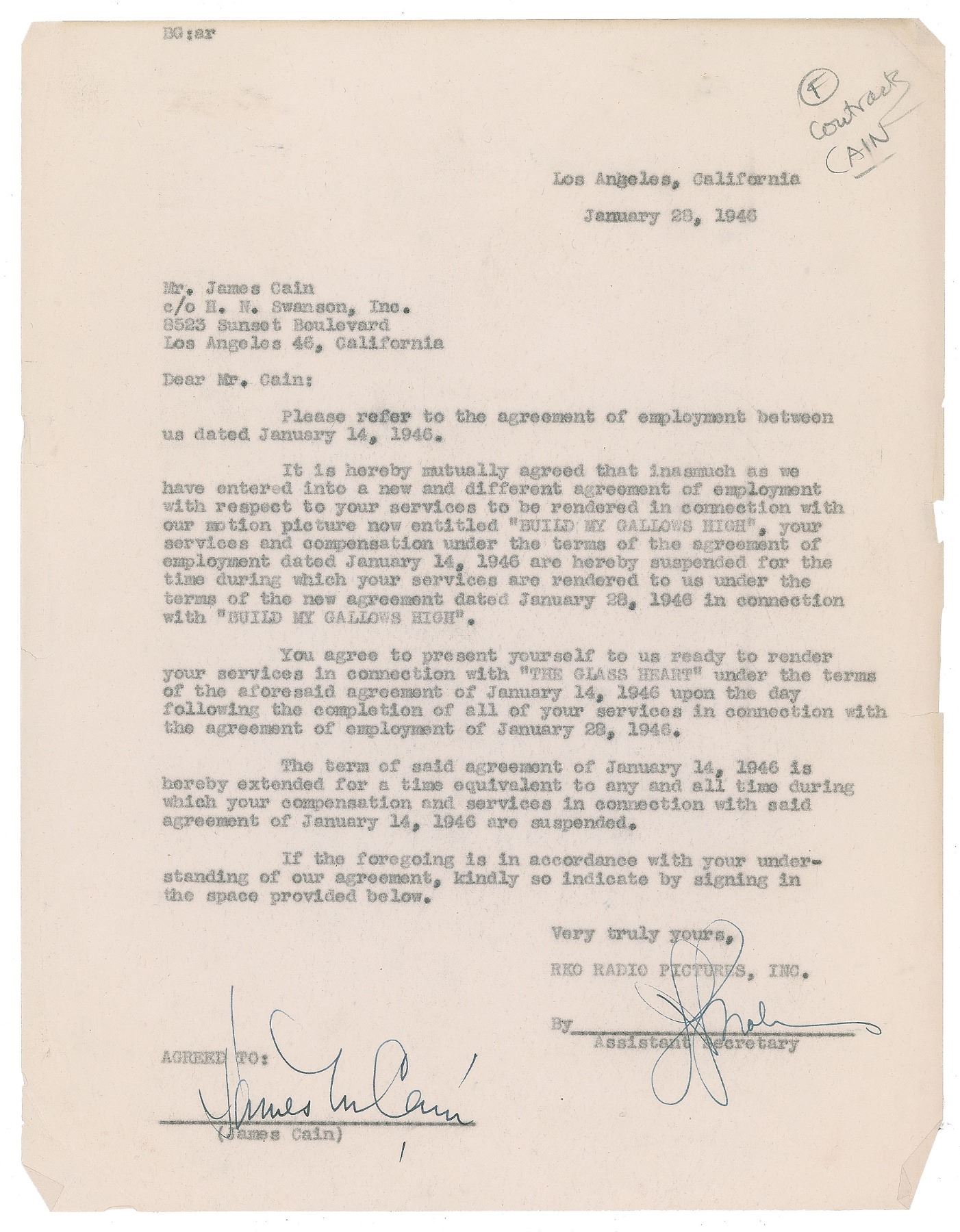 TLS, one page, 8.5 x 11, January 28, 1946. Letter to James M. Cain from RKO Radio Pictures modifying their contract, approved at the conclusion by Cain. In part: "It is hereby mutually agreed that inasmuch as we have entered into a new and different agreement of employment with respect to your services to be rendered in connection with our motion picture now entitled 'Build My Gallows High,' your services and compensation under the terms of the agreement of employment dated January 14, 1946 are hereby suspended for the time during which your services are rendered to us under the terms of the new agreement dated January 28, 1946 in connection with 'Build My Gallows High.' You agree to present yourself to us ready to render your services in connection with 'The Glass Heart' under the terms of the aforesaid agreement…following the completion of all your services." In fine condition, with some corner creasing.